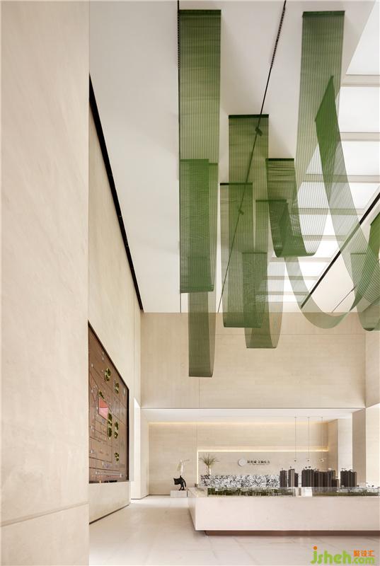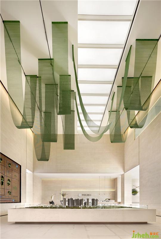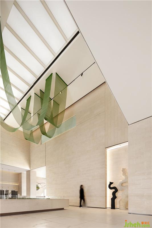 城市脈絡(luò),敘事的美感源于裝置和藝術(shù)品點綴,從客觀實體的物質(zhì)性到使用者接觸與使用界面,綠色和米黃色的空間朦朧穿梭為整體的敘述核心,將山體的形態(tài)抽象至空間之中,豐富了空間的形態(tài)并為人與景增添了多元的互動可能。