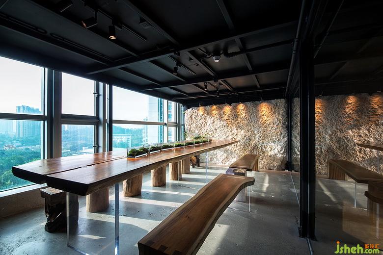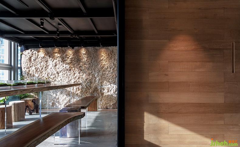 會(huì)客室層高低,卻絲毫不見窒礙之感。完整荒料拼接而成的石頭背墻,粗糲質(zhì)樸,爬墻虎已攀爬其上,綠意盎然。受限于層高,設(shè)計(jì)師以透明桌腳搭配大原木桌面,兼具輕靈與厚重,卻不失溫馨、雅致。設(shè)計(jì)公司原木材質(zhì)的無(wú)背造型木凳,長(zhǎng)短不一,或方或圓,一派灑脫恣意,讓整個(gè)空間都顯得通透不少。
