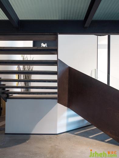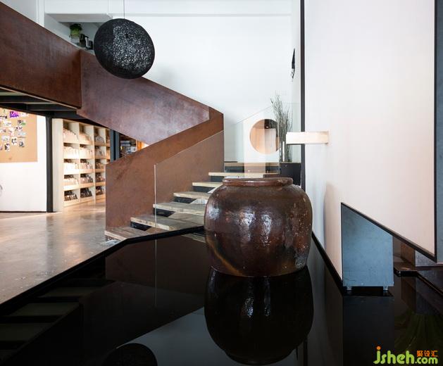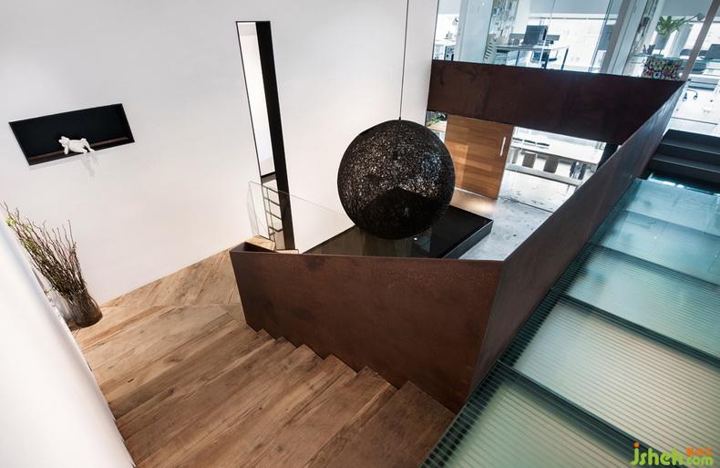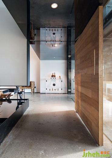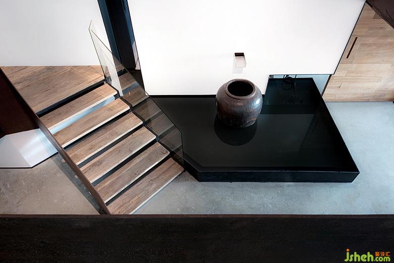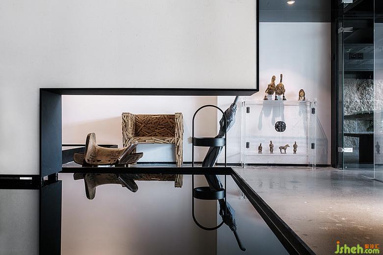樓梯是整個(gè)空間的中心。天橋連接兩端,一側(cè)是創(chuàng)作辦公區(qū),另一側(cè)則是商務(wù)辦公室。設(shè)計(jì)公司商務(wù)辦公室調(diào)性灰冷、克制,選用明亮、靈動(dòng)的透明辦公桌椅,仿若是矗立于閣樓之上的剔透水晶盒?!疤诫U(xiǎn)”踏上一方透明見底的玻璃天橋,轉(zhuǎn)身即是總監(jiān)辦公室。