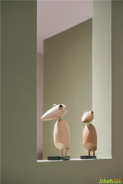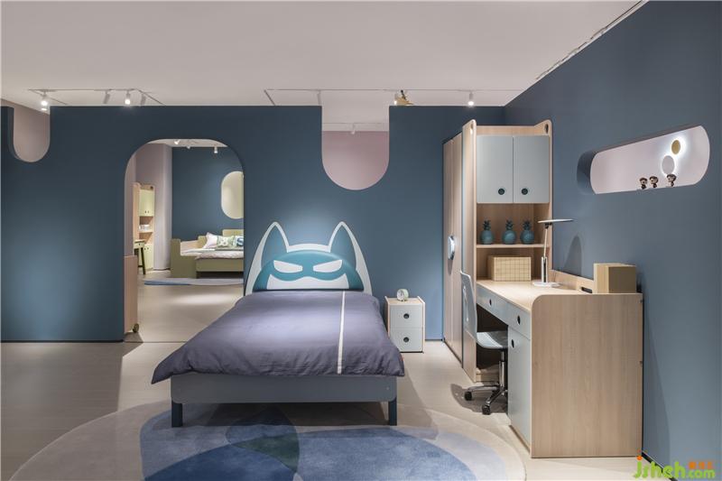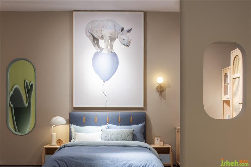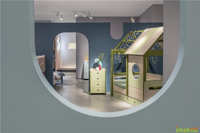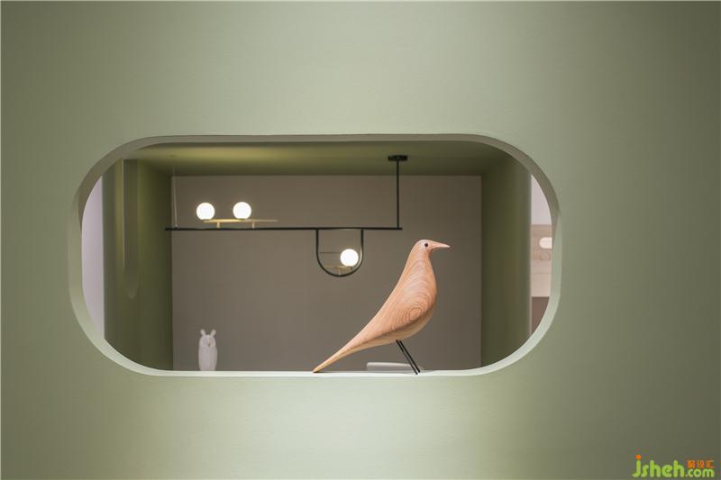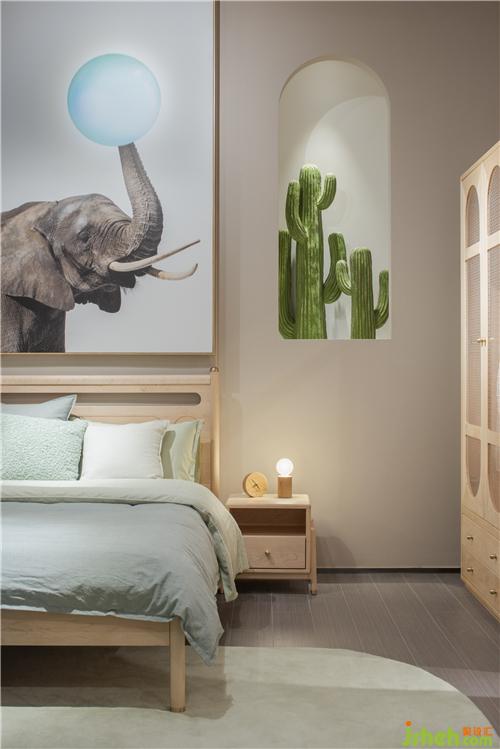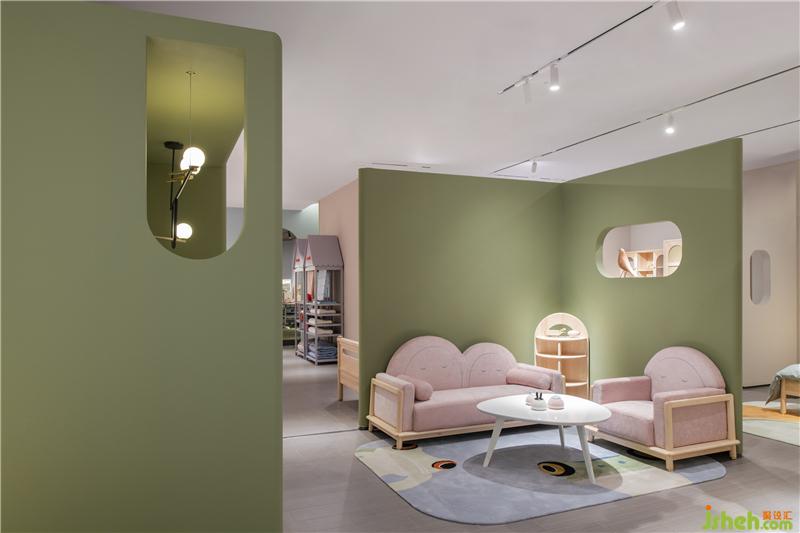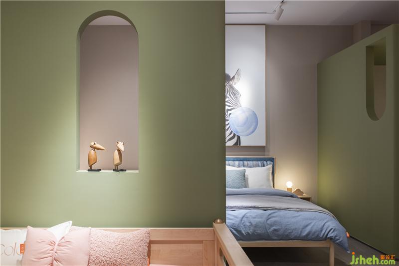 穿過床墊區(qū)可見一柔和氛圍,這便是原木家具展區(qū),原木有著天然的親和力與溫潤的質感,墻身選用象牙色讓空間變得安靜,枯綠色的雕塑墻豐富了空間層次,配上俏皮可愛的動物畫、動物小木偶,家具展廳設計讓寧靜而輕松的空間氛圍添了幾分童趣。