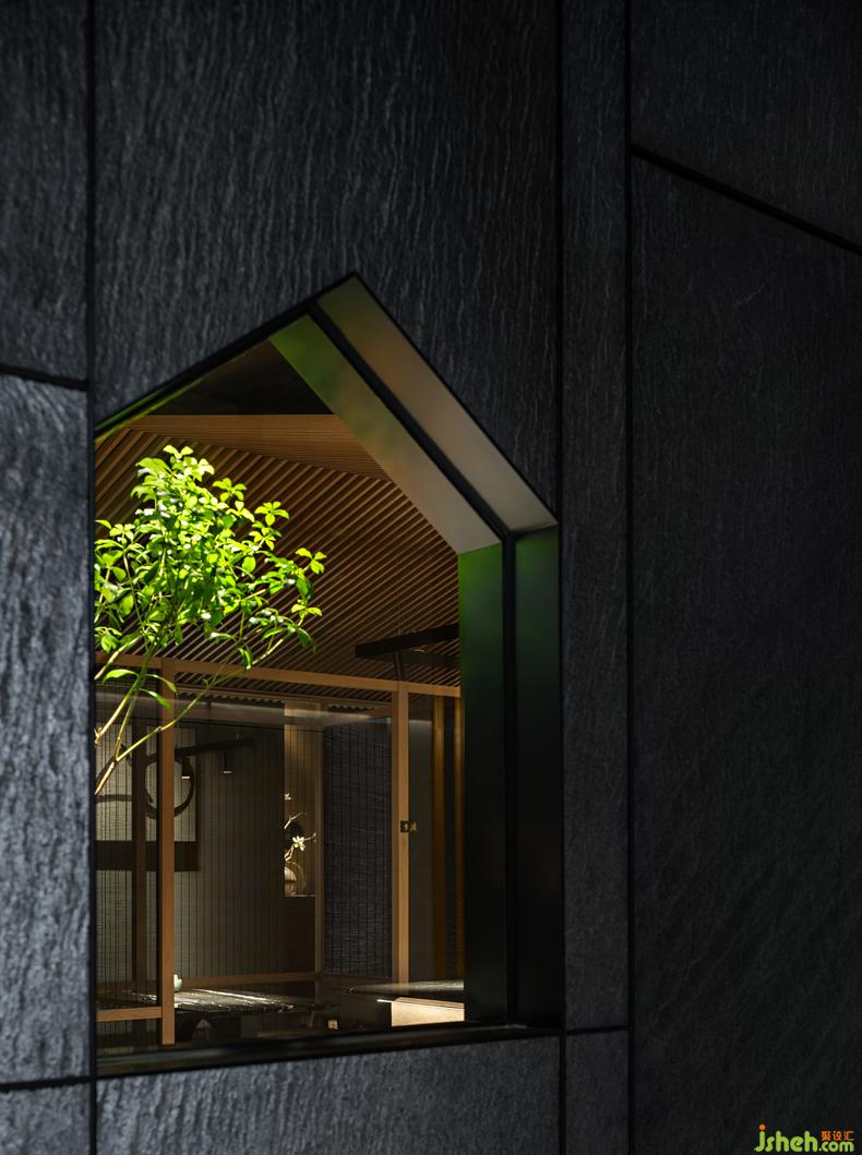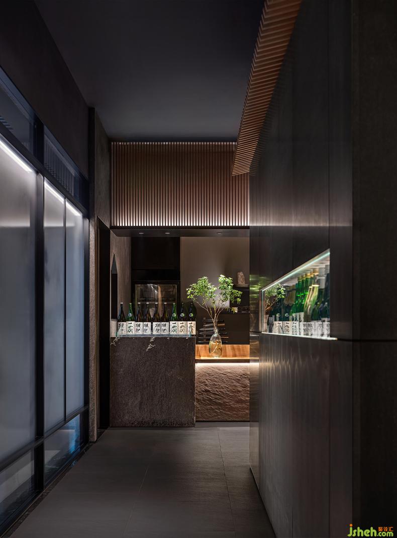 入口處的巖石薄板純粹質(zhì)樸的質(zhì)感呈現(xiàn)出一種靜謐之美,透過一個小屋形狀的窗口,隱約可見刺身臺廚師細(xì)致的工作狀態(tài)。