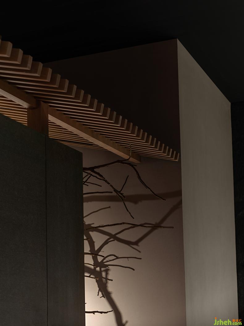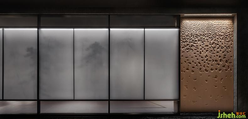 隔屏上下懸挑,豐富了空間的層次。原木雕刻的自動門與墻身融為一體,隱形的設(shè)計增添了一絲神秘。