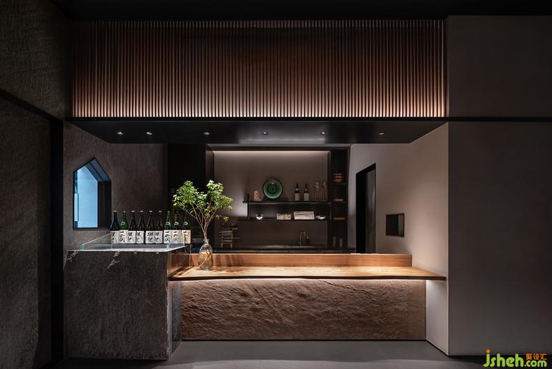 自低矮的屋檐下穿過廊道,迎面便是刺身臺。日料餐廳設(shè)計取材于自然之中,刀劈斧鑿,大巧不工,原石原木的天然質(zhì)感與食物的原汁原味相輔相成。