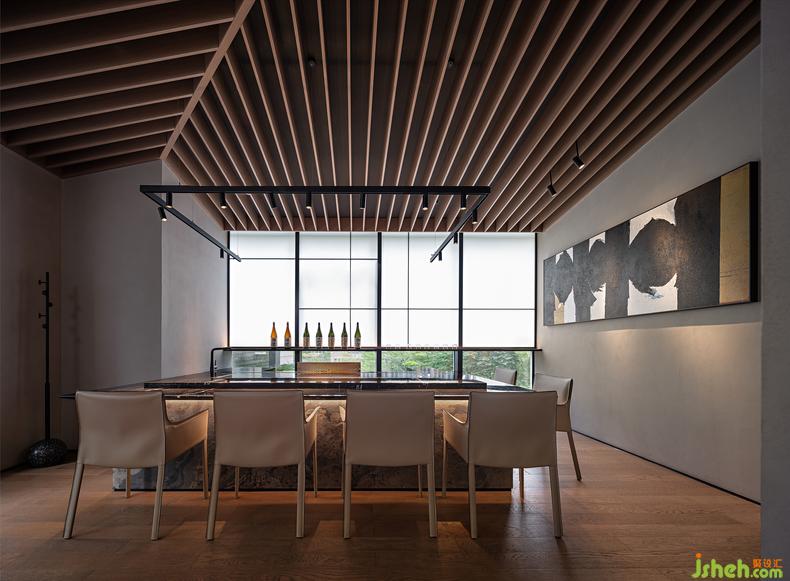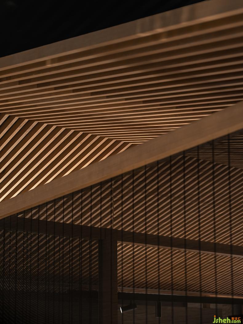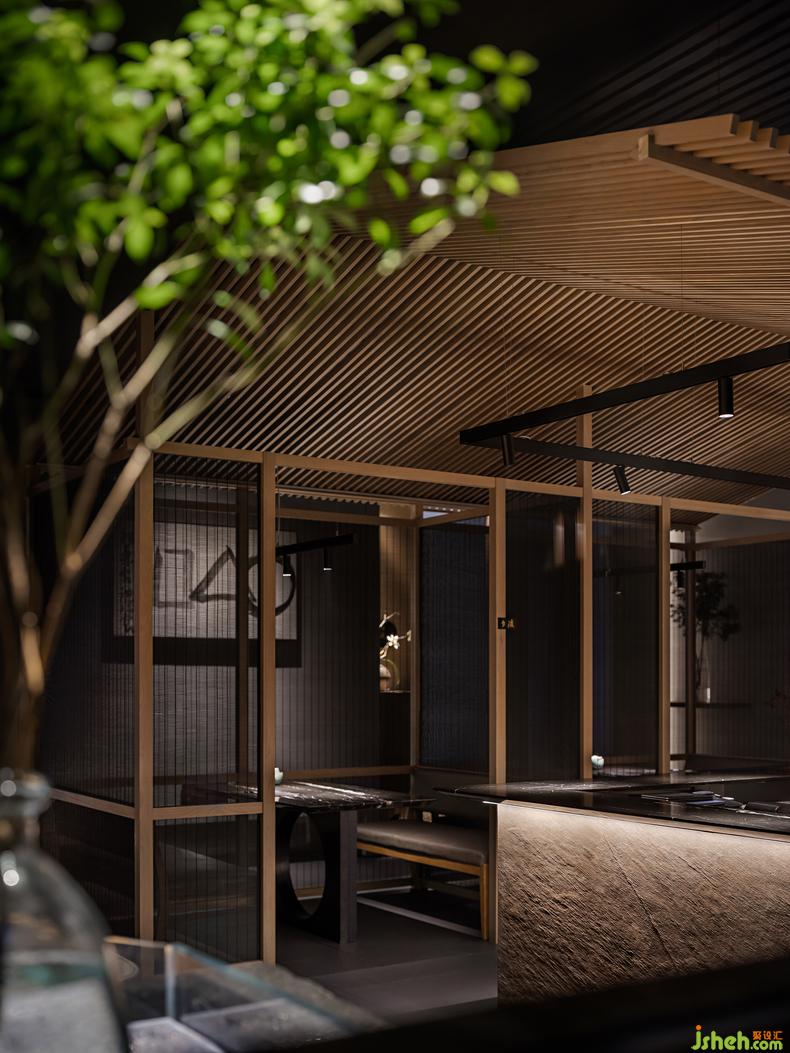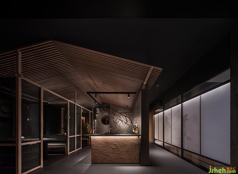 穿過(guò)斜屋頂?shù)闹袕d便是廊道,各個(gè)包間逐漸顯露。