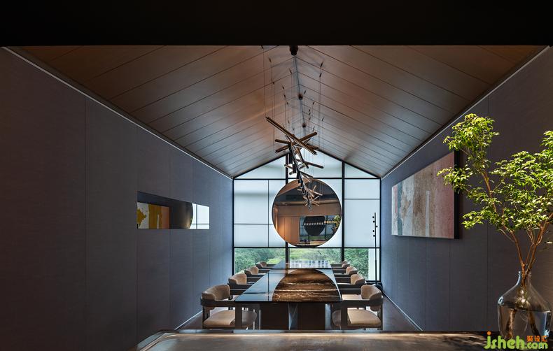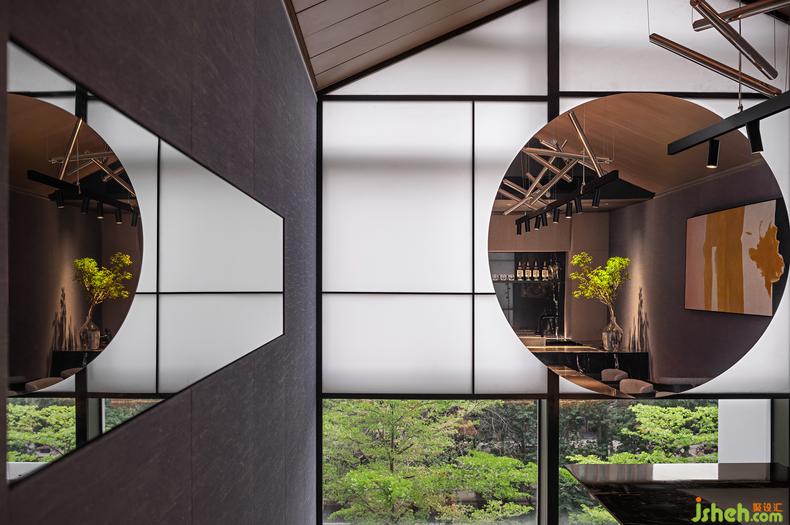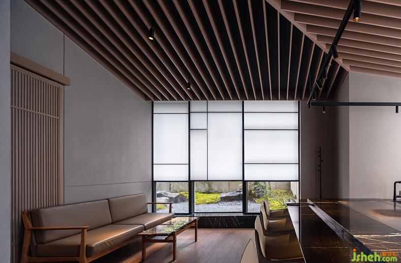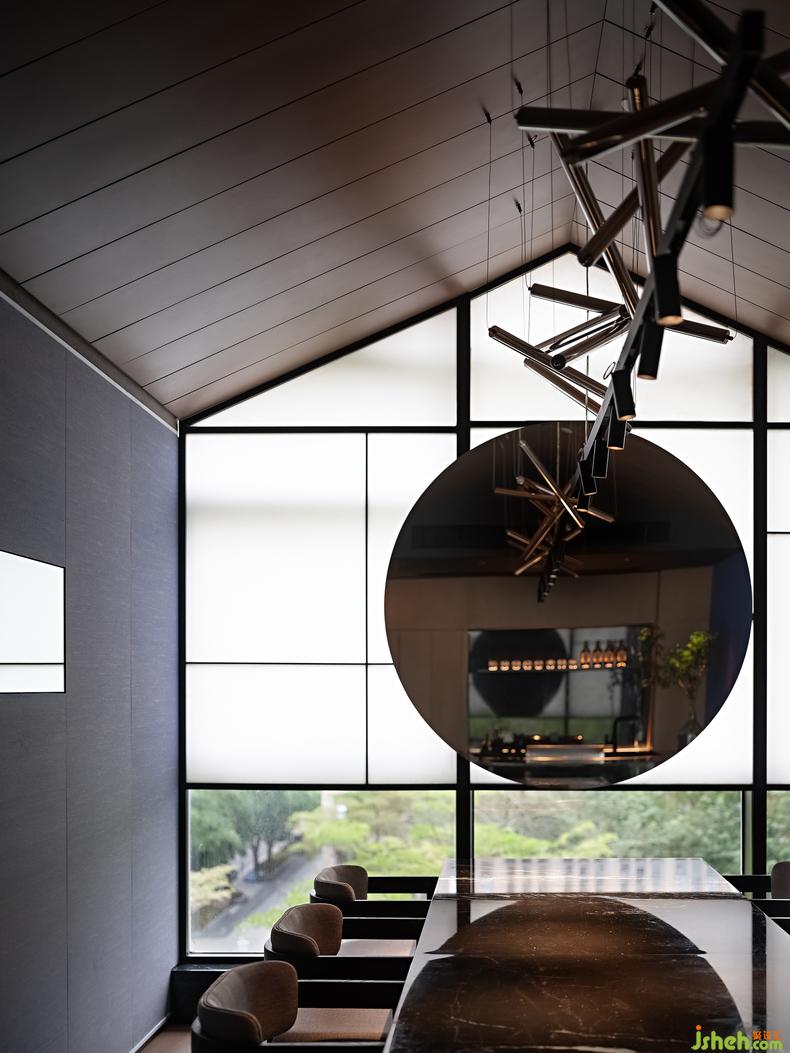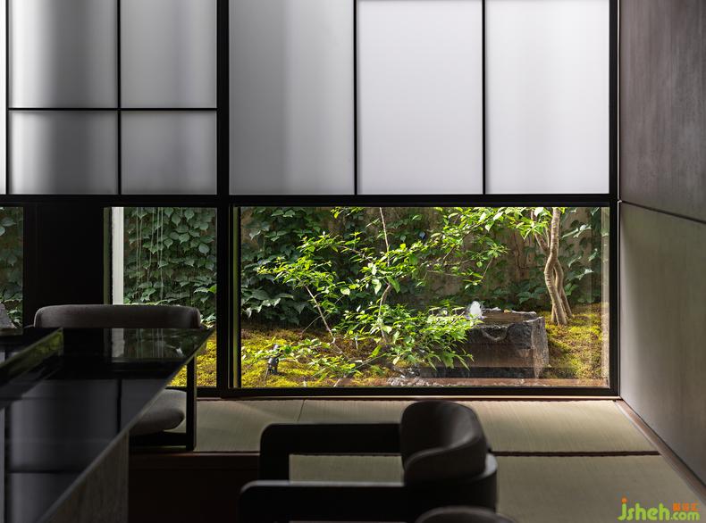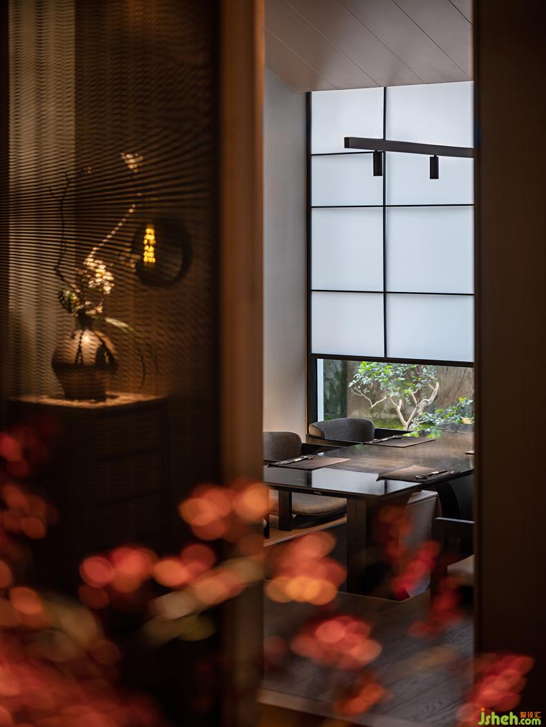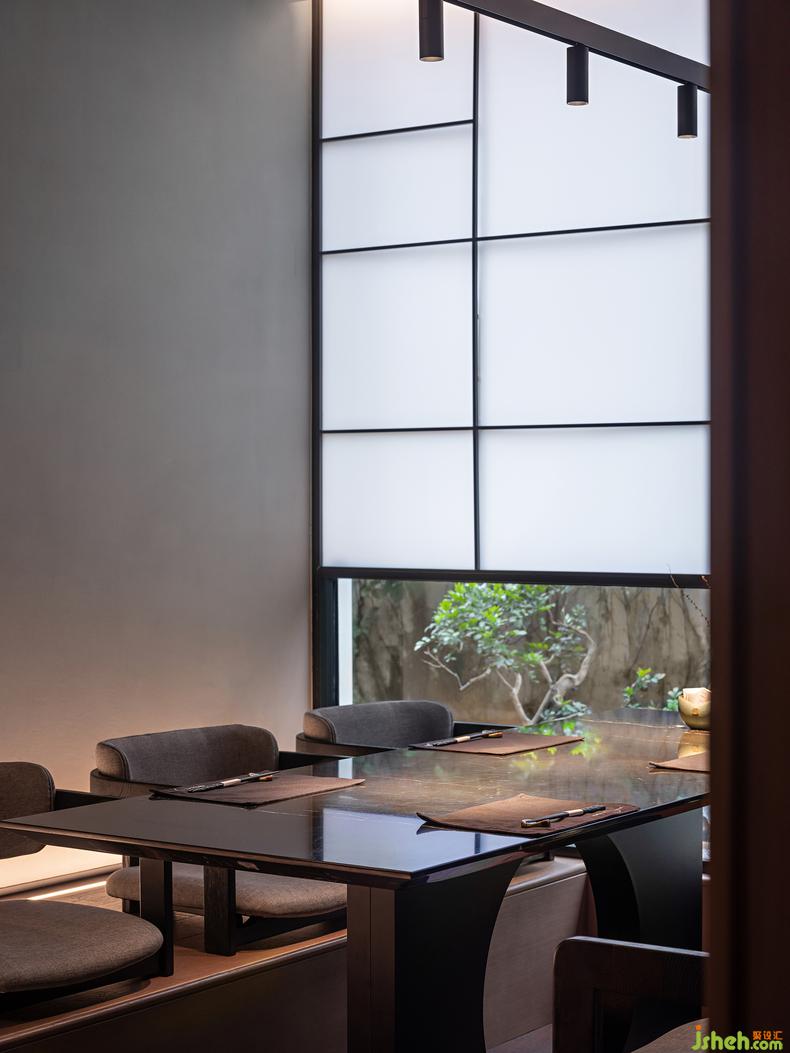 這一間日料餐廳設(shè)計(jì)最大的房在建筑的邊角,兩面窗,一面正對(duì)庭院,另一面可見街道的樹梢。