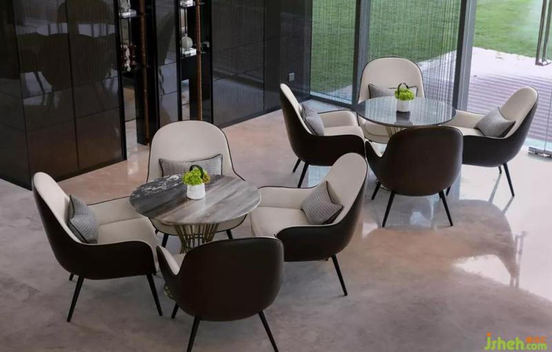 步入洽談區(qū),在家具的選型上,35°盛開的”花瓣”椅用雙面顏色的皮革,一面深棕來呼應硬裝墻面,一面米白來點亮整個空間,黑白灰拉開了帷幕,隨即印入眼簾。