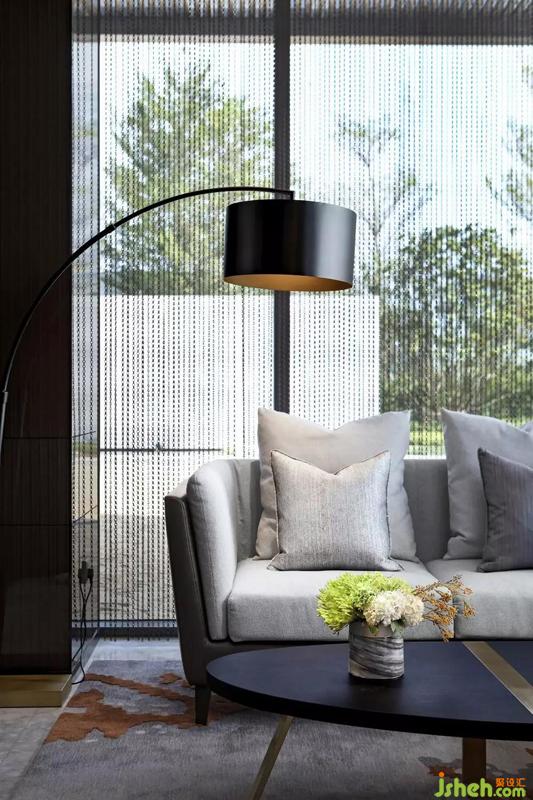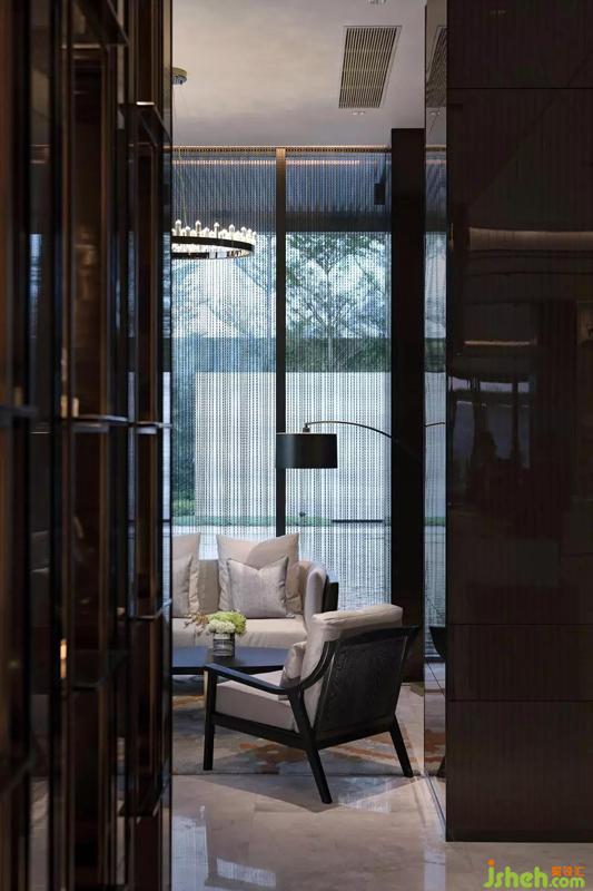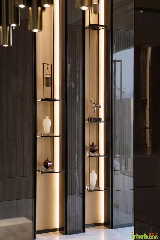 立面空間大膽的用了很多重色,除了用皮質(zhì)的沙發(fā)椅來活躍氣氛,還有金屬線條、透亮的玻璃、白瓷等精致的擺件的參與。