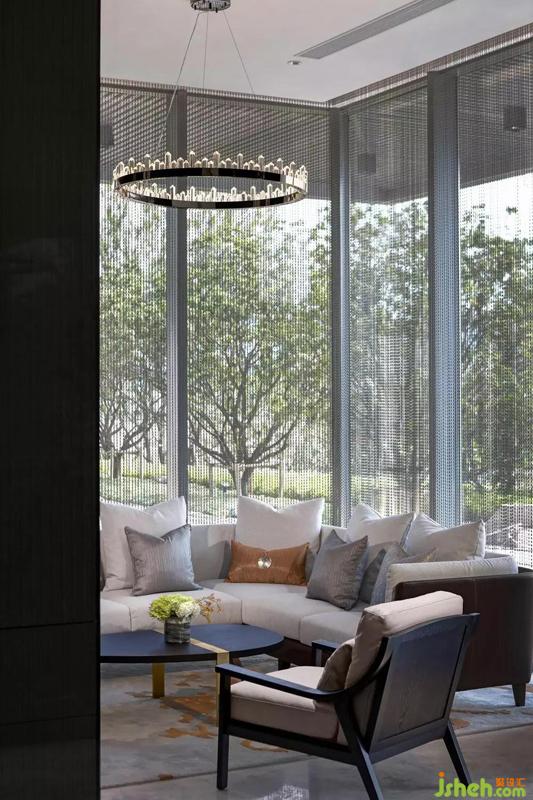 別于散座洽談區(qū)的嚴肅,半私密的這個洽談空間,與窗外二分之一的景,融為一體,一幅不需多加修飾的天然落地畫和一個橙色腰枕,恰到好處的點綴,顯得格外的溫情。