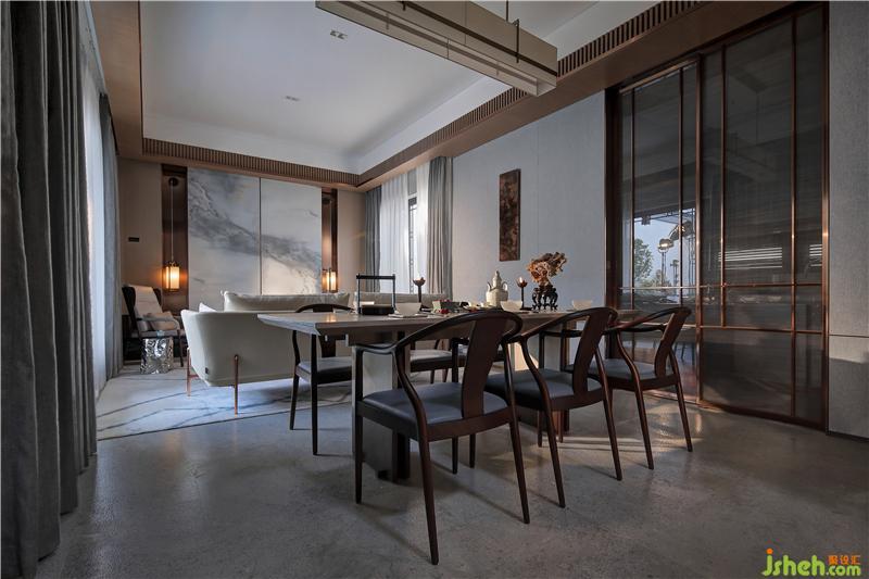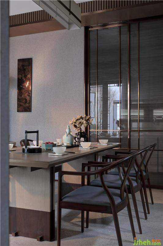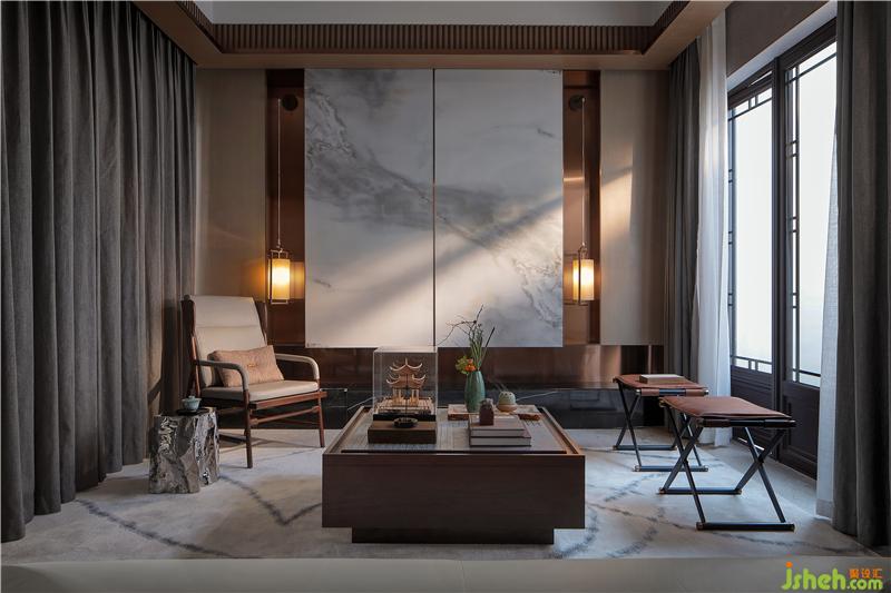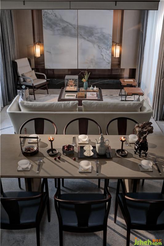 選用石與木相結合的茶幾,散發(fā)靜謐質感,形色質樸的宋代瓷器,寓示自然風雅,