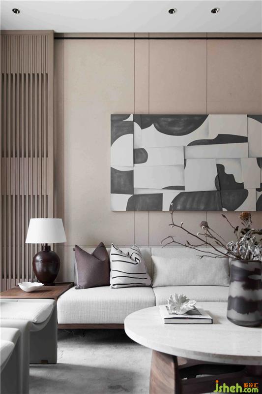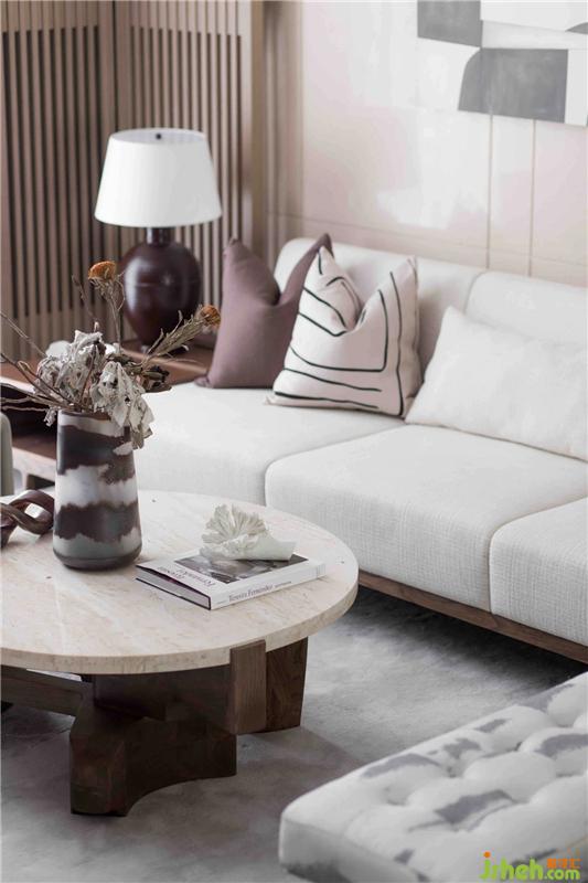 客廳以暖白色調(diào)營造一室清朗寧靜,布藝與木質(zhì)碰撞結(jié)合,沙發(fā)搭配邊凳與茶幾,圍合形成大氣有序的體量,釋放現(xiàn)代中式的美感與層次。