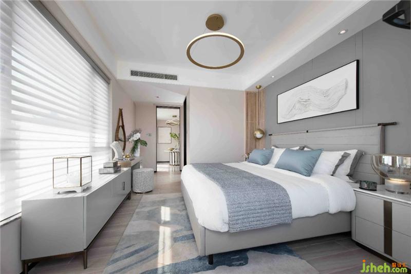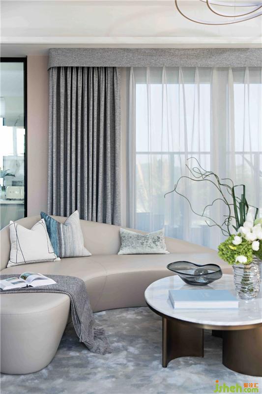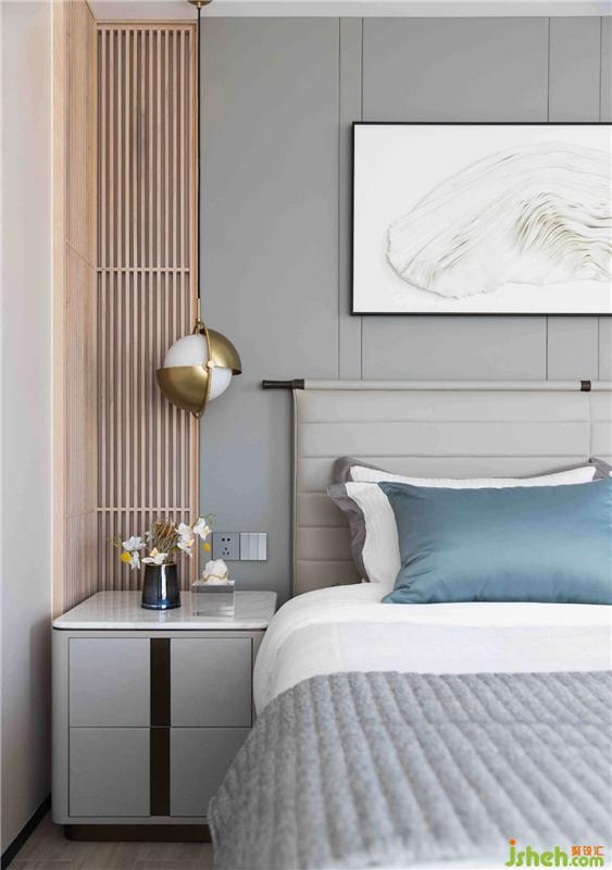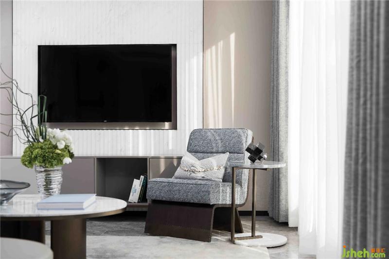 不同層次高級灰的色彩運用,結(jié)合細(xì)致的幾何縱向線條,鋪排出極具現(xiàn)代感的美學(xué)風(fēng)尚,黃銅質(zhì)感的金屬飾品勾連起空間的藝術(shù)想象。
