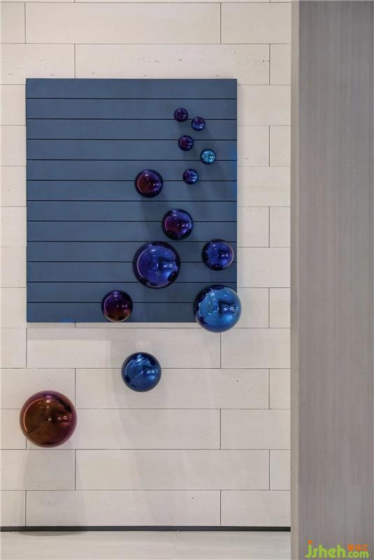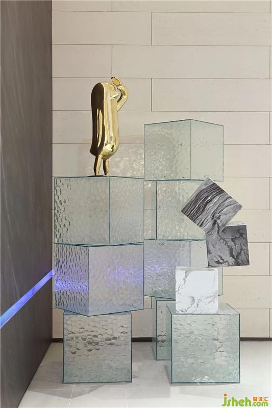 塊狀玻璃的藝術(shù)擺件與石紋的隔斷墻交相輝映,使人與自然共感。