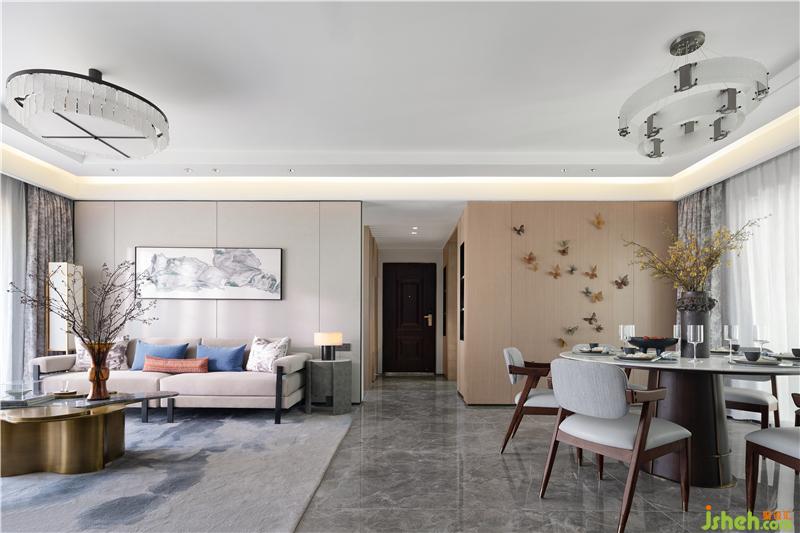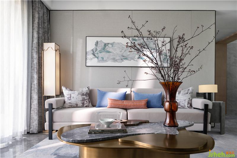 客廳低飽和度的色調(diào)素簡而沉穩(wěn),氣度不俗,背景墻上以園林假山石為靈感的裝飾畫則恰到好處的還原了東方園林的獨特氣質(zhì)。