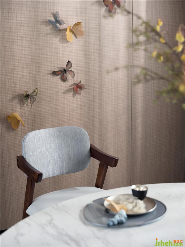 餐廳背景墻的肌理細(xì)膩而勻稱,線條縱橫萬千,于細(xì)微之處將意境拉滿,棲居之上的蝴蝶栩栩如生,展翅欲飛,營造出了靈動而活潑的空間氛圍,增添了視覺層次感,提升了居家品質(zhì)感,渲染出質(zhì)樸天然的美感。