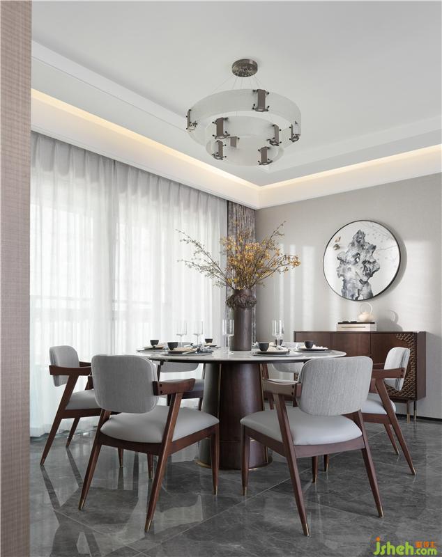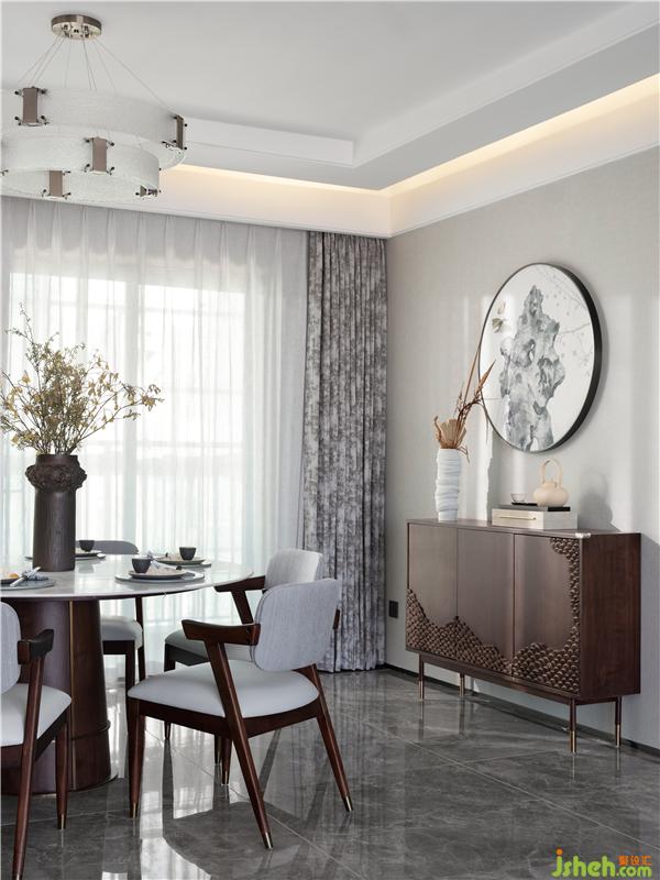 吊燈造型別致,溫潤而柔和的質(zhì)感為空間增添了些許暖意。餐桌餐椅古樸的色彩與整體空間相得益彰,精致的擺件、花束的風(fēng)雅、每一個物件的挑選,都貫注著獨特的氣韻與詩意,細(xì)微之下,靜靜訴說著東方意境之美。