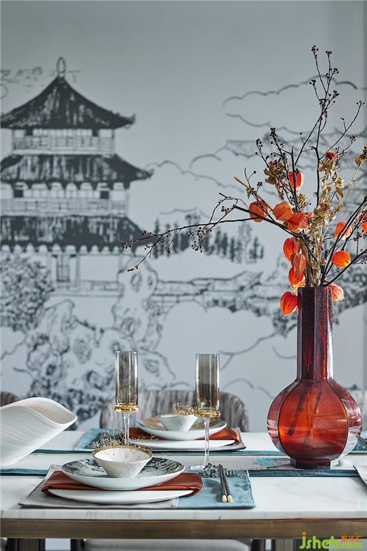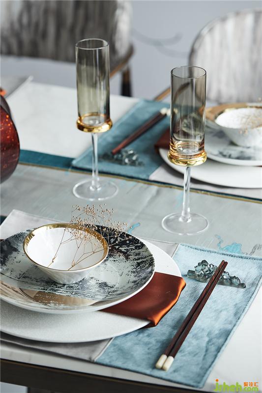 餐桌擺件精致而有序,不僅提升了空間的裝飾檔次,也將用餐的儀式感拉滿,讓氛圍自在流動,以此營造不同的視覺感官,體現空間的包容性,傳遞著精致的“慢生活”生活方式。
