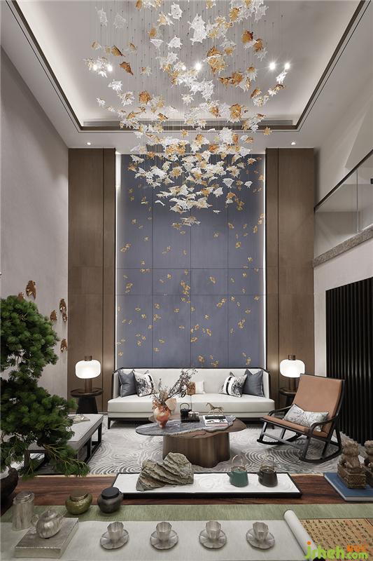 茶室的設計集休閑與禪意一體。天花的藝術裝置采用了象征著鴻運、溫情、自然的楓葉為造型,為空間增添了一分擁抱自然、天然去雕飾的獨特氣質。