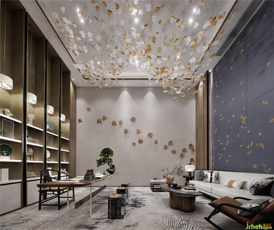 背景墻上飛舞的銀杏灑脫中帶有幾分隨性,為整個空間注入一絲靈動與活躍之感。