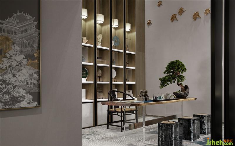 茶臺上小型松樹盆景橫挑構成形態(tài)之美,賦予空間生命力,讓韻味典雅的東方禪意躍然于眼前。