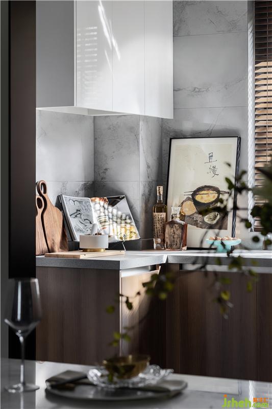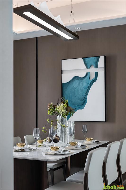 吊燈如綿延起伏的山巒,造型創(chuàng)意十足,長(zhǎng)沙樣板房設(shè)計(jì)裝飾畫好似碧波輕漾,泛起一池漣漪,精致整齊的餐具,簡(jiǎn)約雅致的餐椅,餐廳與廚房里的每一處每一物,都在用他們獨(dú)有的材質(zhì)和色彩,訴說著關(guān)于家故事。