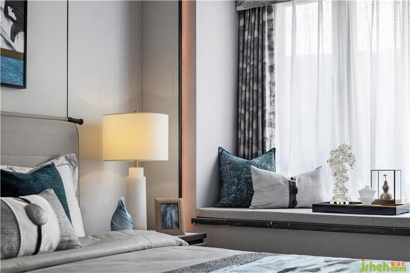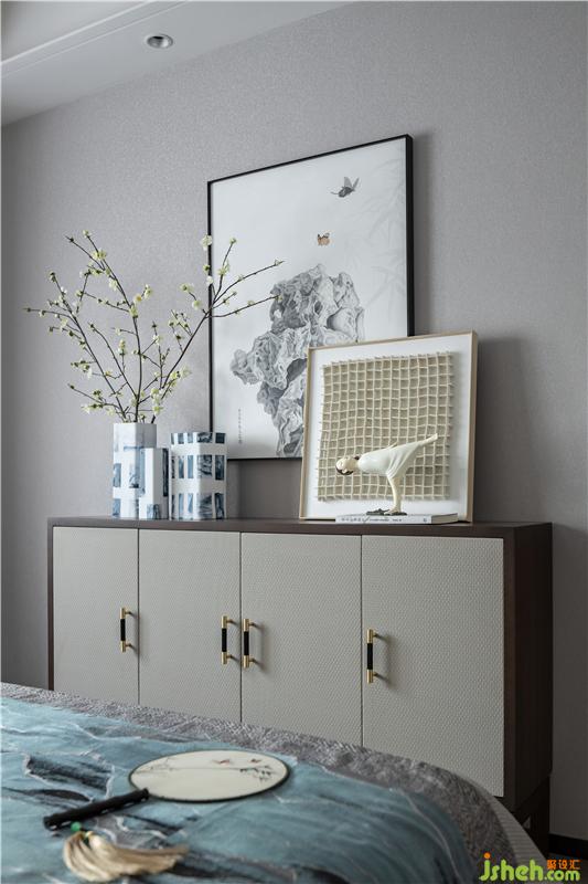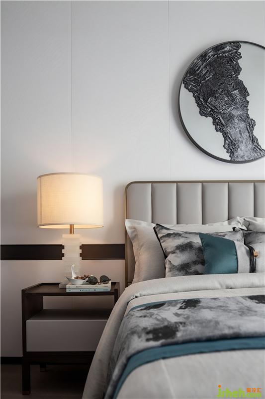 臥室清雅透亮,將寫意之美淡淡暈染開來,松風(fēng)雅月,和田玉雕,淺灰色的硬包,再加以金屬點(diǎn)綴,奢而不過,美感天成。