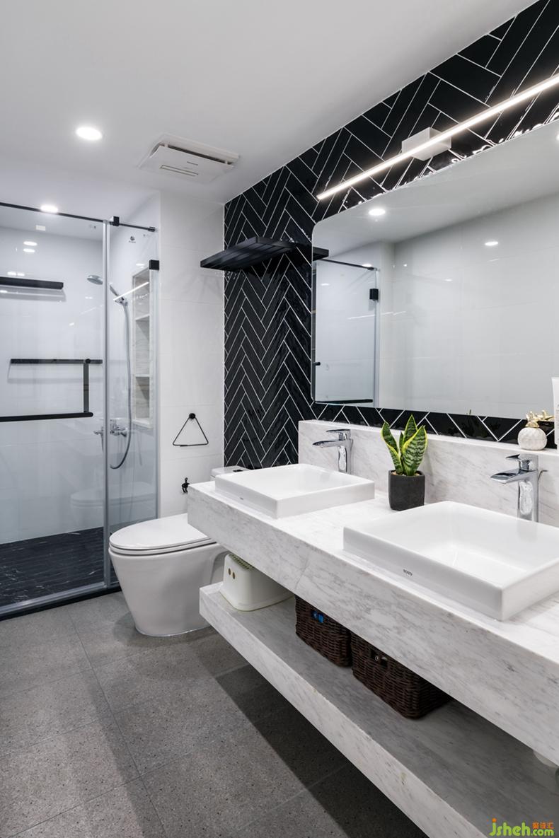 衛(wèi)生間為經(jīng)典的黑白搭配,墻面采用10*30的小黑磚人字鋪貼,時(shí)尚并富有個(gè)性。