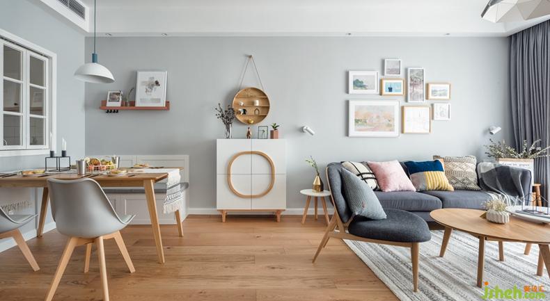 以白色和原木色打底,搭配深深淺淺的灰色穿插在空間里,通過抱枕和掛畫的色彩及幾何圖案點亮空間表情,不多不少,恰到好處。