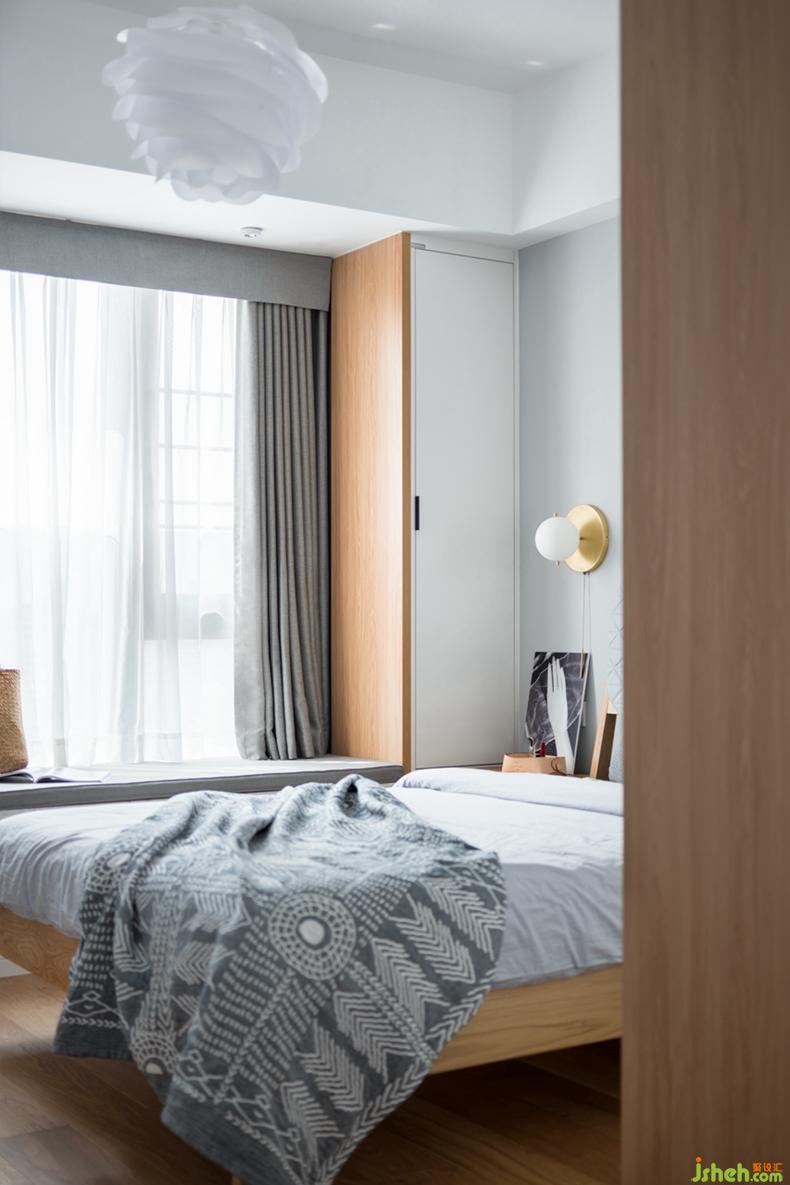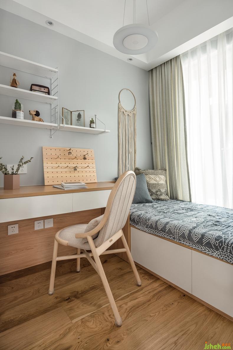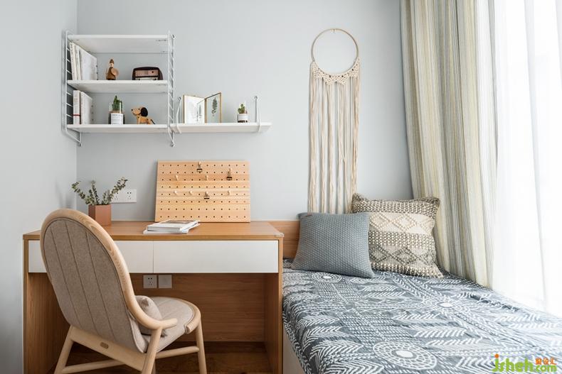 客房延續(xù)了客廳主調(diào),由于空間較小,客房采用集約化設(shè)計,書桌,榻榻米,衣柜整體定制,有效的利用了每一寸角落。在軟裝搭配上,動手能力很強(qiáng)的小姐姐拿出了自己編織的捕夢網(wǎng)放在床頭,讓夜晚的空氣充滿夢幻,擁有美好夢鄉(xiāng)。