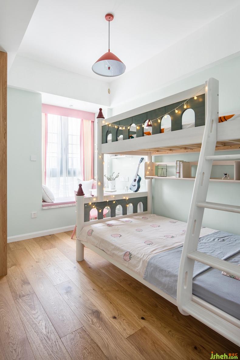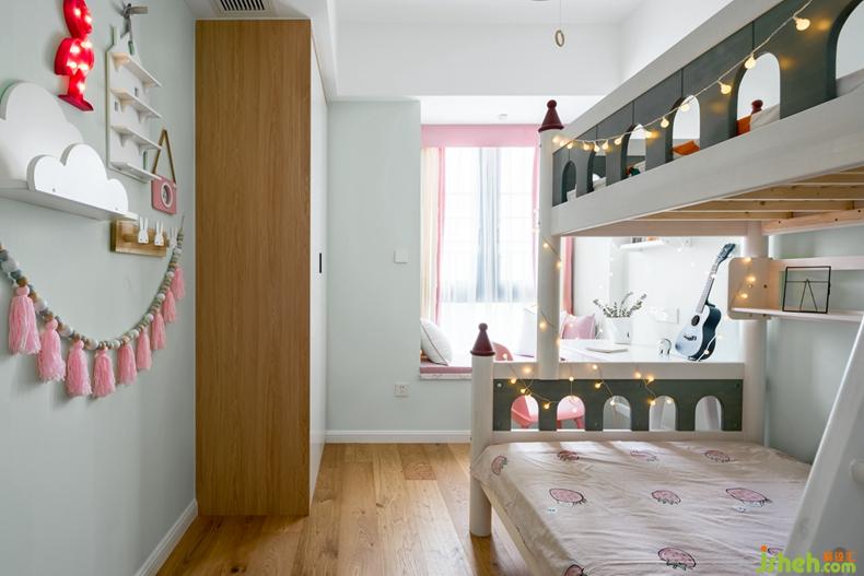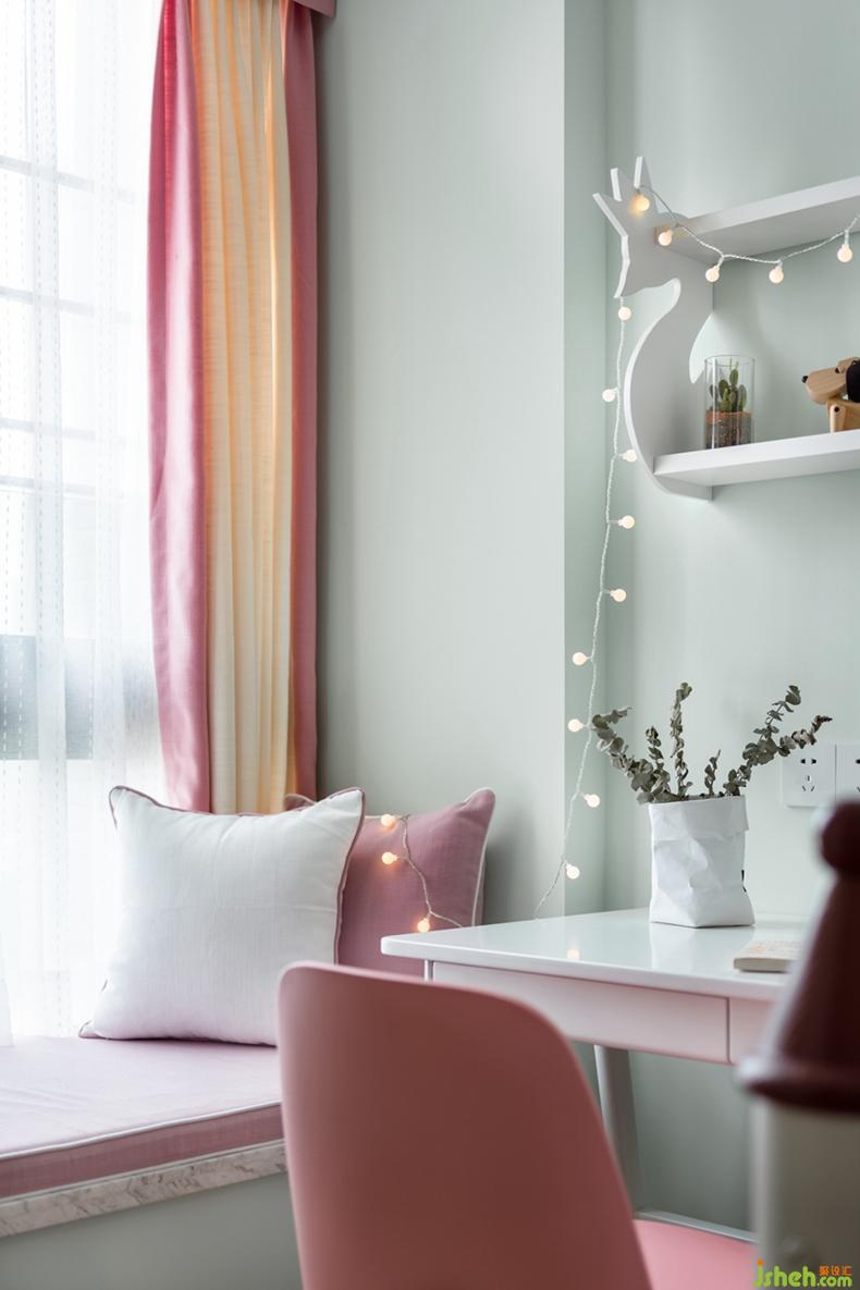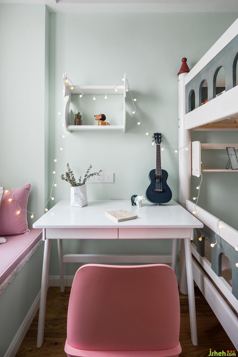 以淺綠色打底,粉色點(diǎn)綴,如童話里的城堡一般床,掛一串串燈,夜晚的屋子里也有星星點(diǎn)點(diǎn)的浪漫,一閃一閃,仿佛夢幻的感覺。