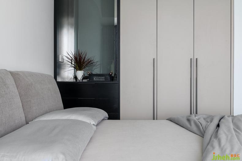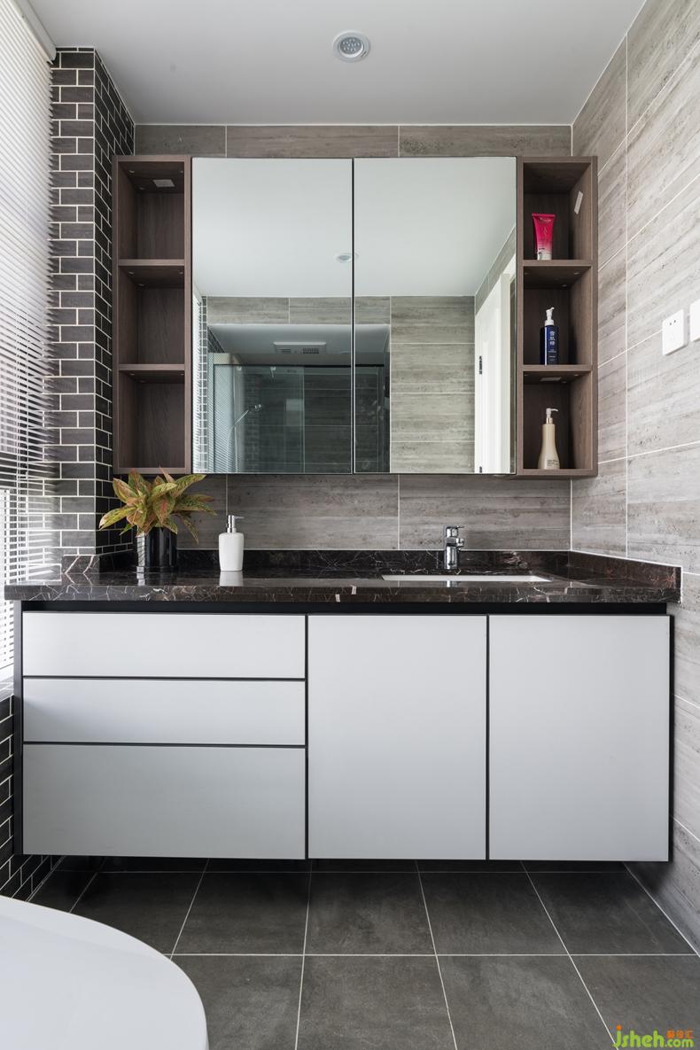 灰色調(diào)同樣是衛(wèi)生間空間的主色,白色的烤漆柜和白色的瓷盆明亮干凈,大面積的鏡柜即解決了儲(chǔ)物空間也使得空間明亮通透。