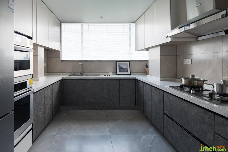 拓展后的廚房由原來(lái)的雙條型變成了U型,滿足了各種功能和操作上的需求,考慮到整體性,廚房延續(xù)了客廳的主基調(diào)。