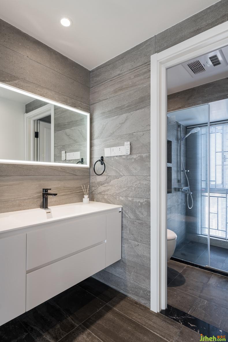 設(shè)計(jì)師開(kāi)放公共衛(wèi)生間的洗手臺(tái)區(qū)域,與懸掛馬桶和淋浴間區(qū)分開(kāi)來(lái)是為了調(diào)整狹長(zhǎng)的過(guò)道空間,與過(guò)道區(qū)域共享。室內(nèi)設(shè)計(jì)師