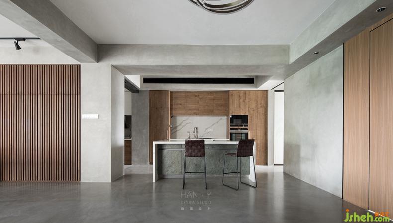 大片的木色與島臺的白色強(qiáng)烈對比,增強(qiáng)空間立體感。內(nèi)斂附有層次的木紋和純凈明亮的白色大理石,分別作為灶臺區(qū)/收納區(qū) 還有島臺的主色調(diào),涇渭分明的大塊對比色,為廚房空間營造出生活的韻律感。