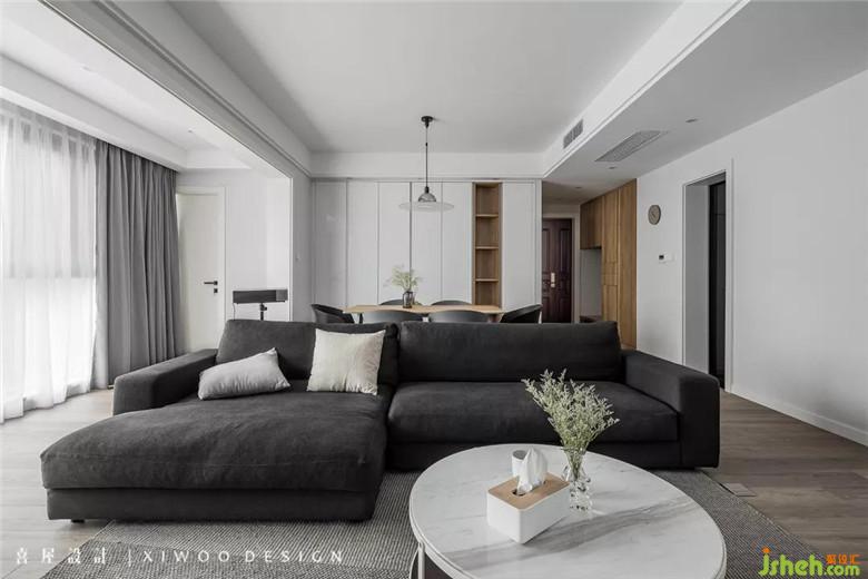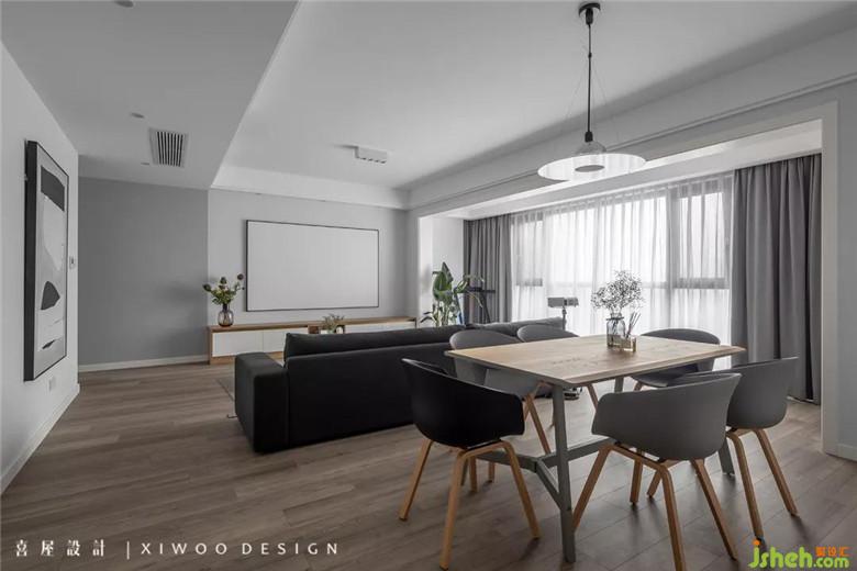 傳統(tǒng)簡(jiǎn)約風(fēng)格的室內(nèi)設(shè)計(jì)大多以黑白灰為主,要打破傳統(tǒng)并保留溫度,需要裝修公司運(yùn)用色彩元素的技巧。深色沙發(fā)、黑色餐椅、白色墻面、木色柜體、窗簾等色彩語(yǔ)素使整個(gè)空間達(dá)到溫暖的簡(jiǎn)約恬靜。