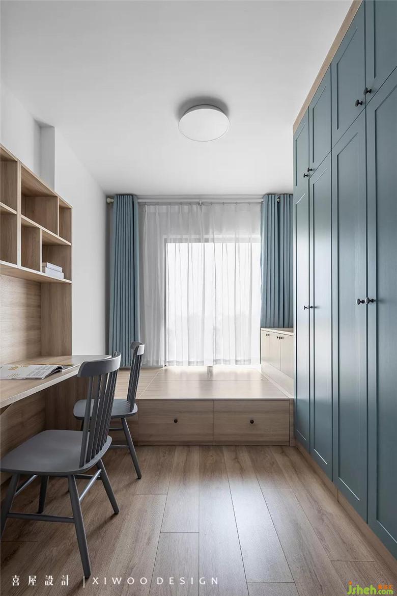 男孩房整體布局呈U型狀,選擇儲物和寢居功能為一體的榻榻米形式,與整體衣柜形成一個靈動活潑的藍色整合體。大書桌前,哥哥耐心的為妹妹講著藍胖子與大熊的故事。隨著時間的運行不斷變化,他們逐漸長大,這種空間的經(jīng)驗與記憶也會漸漸成為他們童年的回憶。