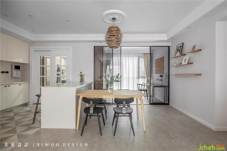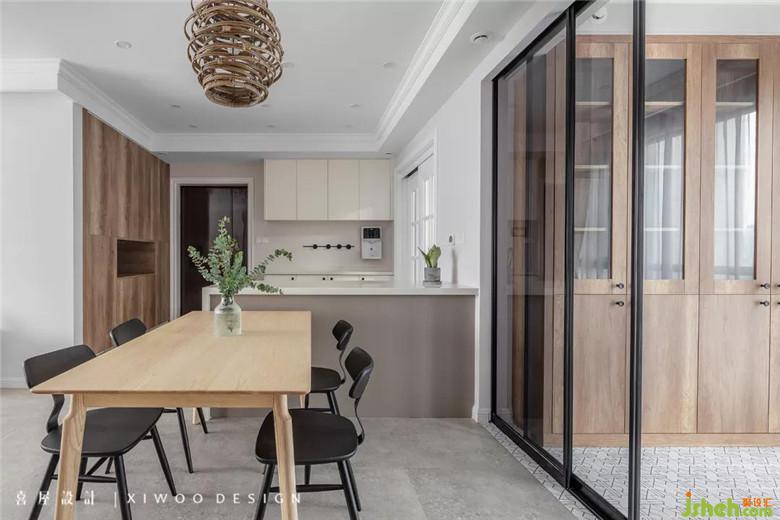廚房和書房的玻璃門使大量的采光透入進(jìn)來,餐廚空間是一個(gè)家的溫暖所在,人生百味皆匯聚于此。