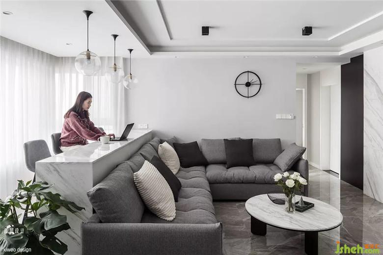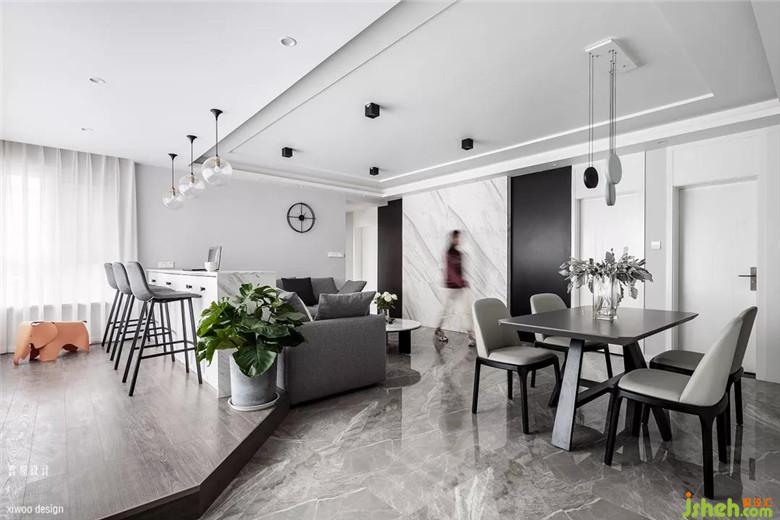 吧臺和客廳用吊頂和地臺的高低差界定一如弦歌起伏有致