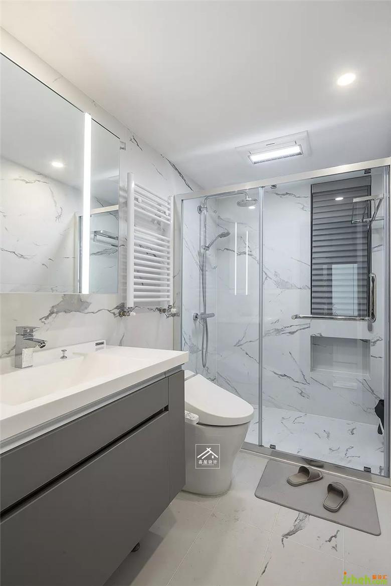 衛(wèi)生間采用白色石材紋理的墻地磚一體。帶燈光的鏡柜方便使用。