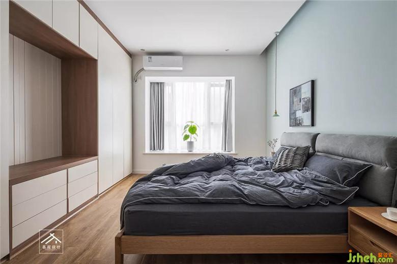 主臥室床對(duì)著做了一面墻的衣柜,中間可以放電視。