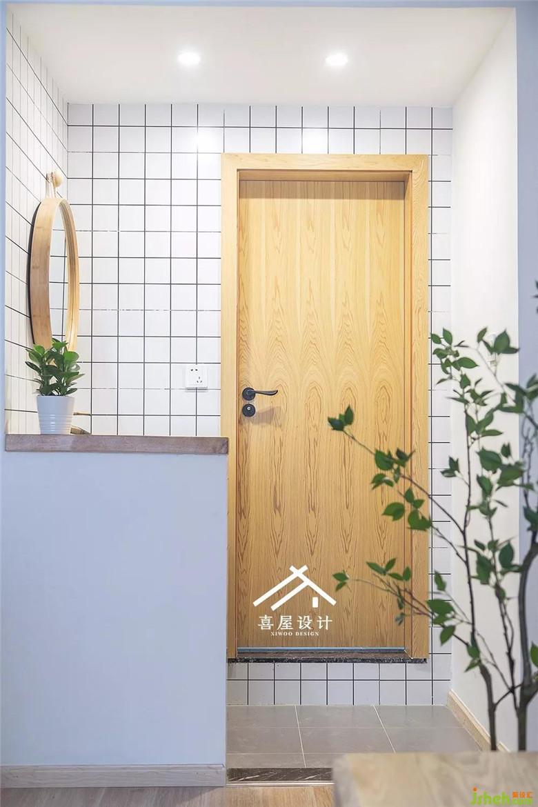 從客廳看次衛(wèi),因?yàn)樽隽硕妆?,所以抬高?5cm。又恰好形成了巧妙的空間區(qū)隔,從外看去又是處好景致。