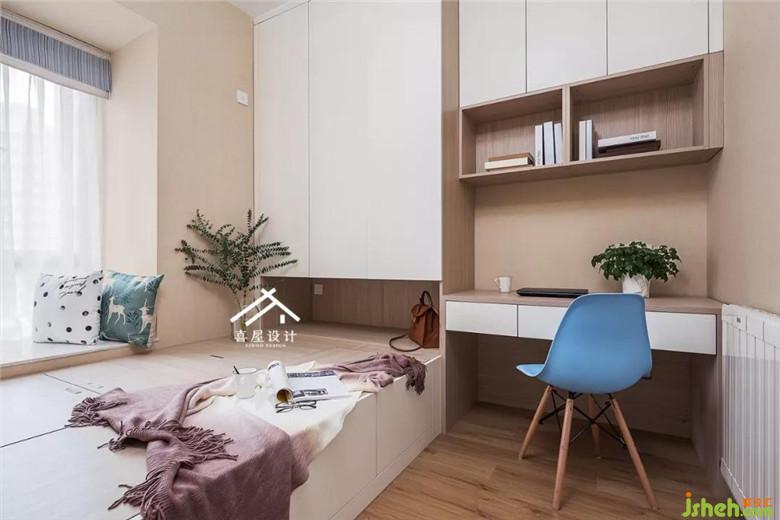 室內(nèi)設(shè)計(jì)師在次臥室做了榻榻米兼書房,榻榻米寬度1.5米,還剩下1.26米做了書桌,榻榻米側(cè)面做了抽屜,方便抽出來就可以儲物,榻榻米里面做了可以上掀門的儲物空間。