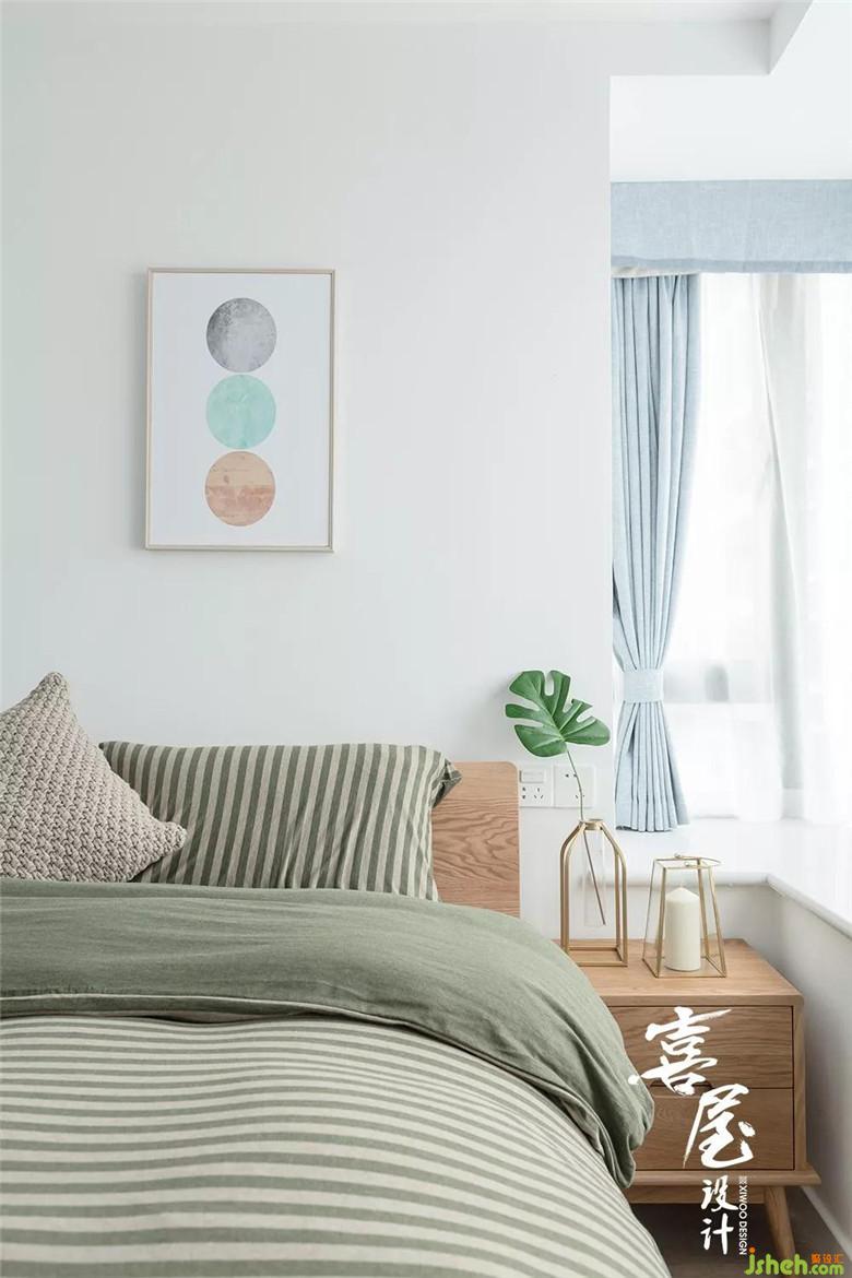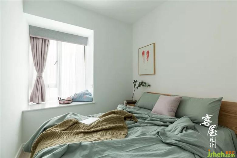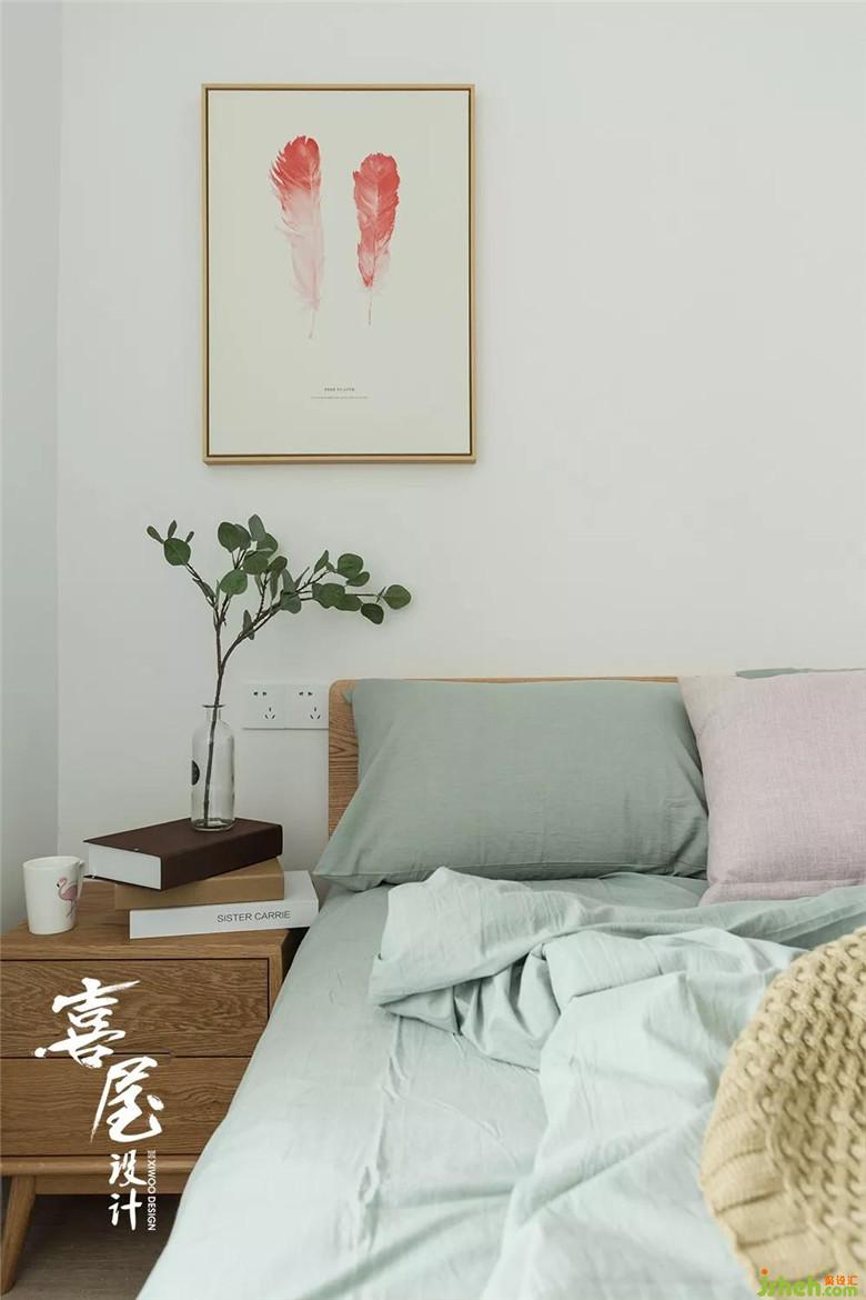 裝修設(shè)計(jì)在次臥室用了原木的床和床頭柜,綠色配粉色的床品。