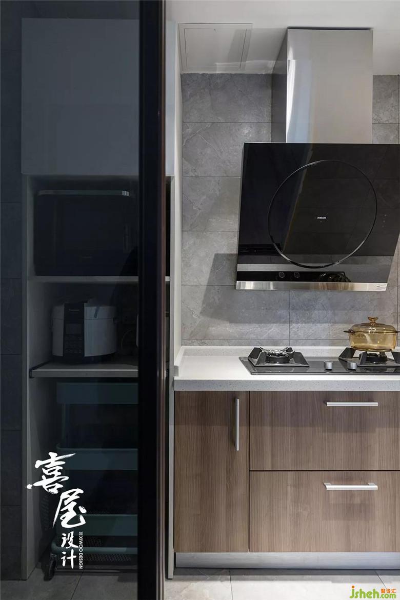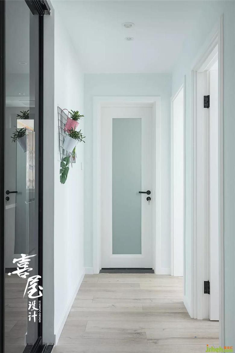 把原來進(jìn)深長(zhǎng)的走廊做了1,8米的黑框廚房推拉門,增加廚房采光,也弱化了過道。每處門廊都能帶來陽(yáng)光的驚喜。