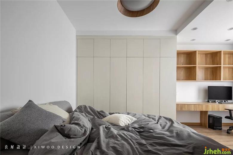 主臥以清淺的白色、靜謐的灰色和沉穩(wěn)的原木為主基調(diào),不做過多裝飾。室內(nèi)所有物件,或袒露材質(zhì)上的肌理與質(zhì)感,強(qiáng)調(diào)睡眠空間所需的舒適感;或融入整體感的衣柜和書桌,達(dá)到空間功能與比例上的均衡。