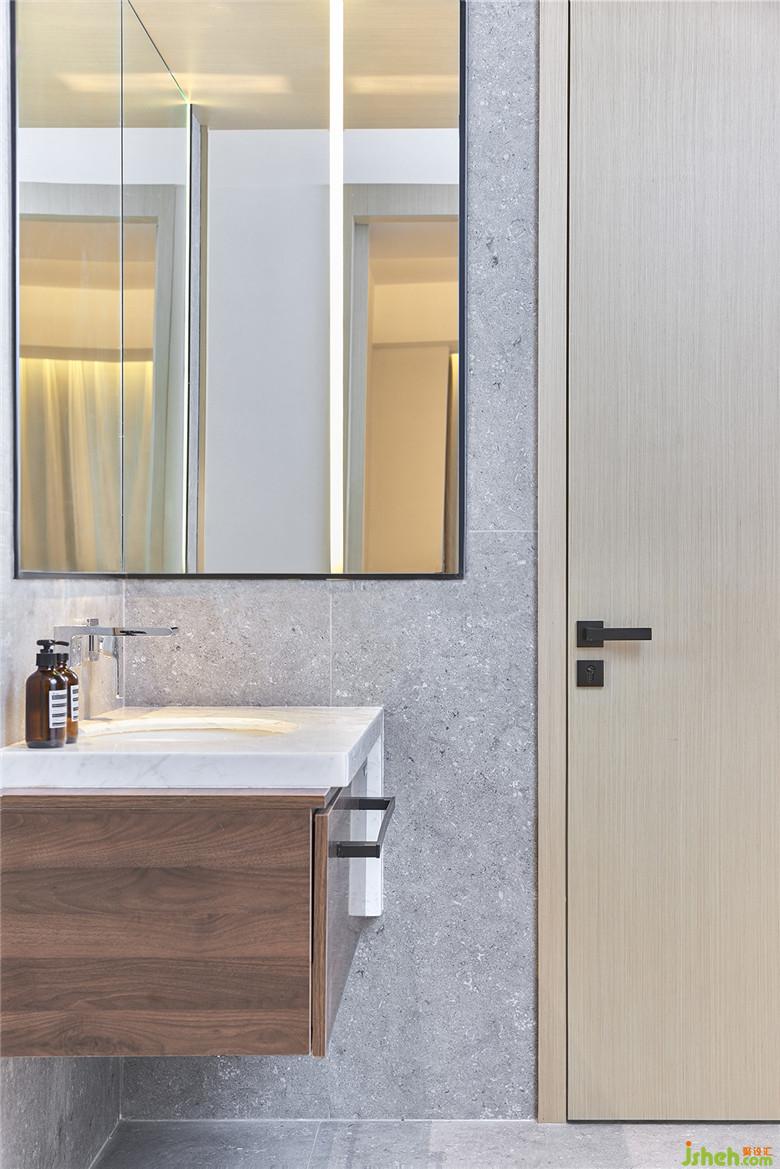 進入主衛(wèi)浴室,在白色極簡的空間設計中,黑色及灰色線條的使用顯得格外重要,既能打破固有的單調,又能讓空間更富有層次,同時創(chuàng)造出時尚、精致的衛(wèi)浴空間。