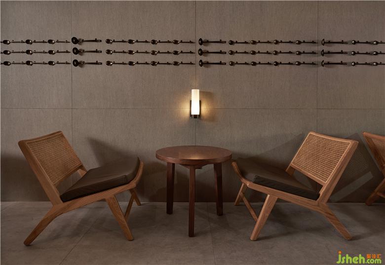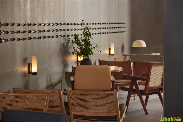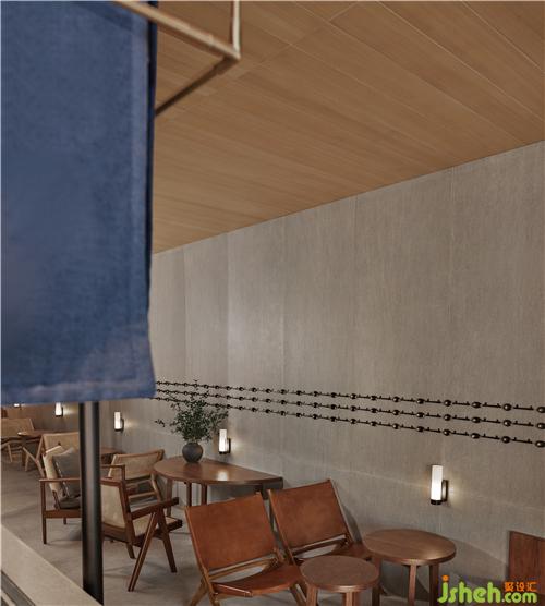 在設(shè)計上,設(shè)計師在墻面用干凈的灰色與頂面溫潤的木飾面作為基調(diào),讓空間附有美感的同時又具有豐厚的生活氣息,精致金屬管的搭接結(jié)構(gòu),及其點綴的藍色麻布簾子更是讓整個空間更具豐富的想象力。餐廳裝修演繹成了現(xiàn)代視覺語言,重塑了回憶的空間……