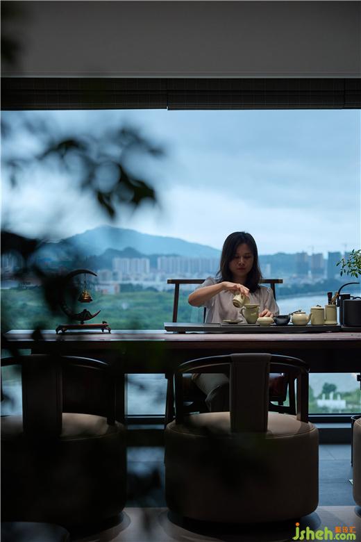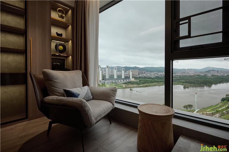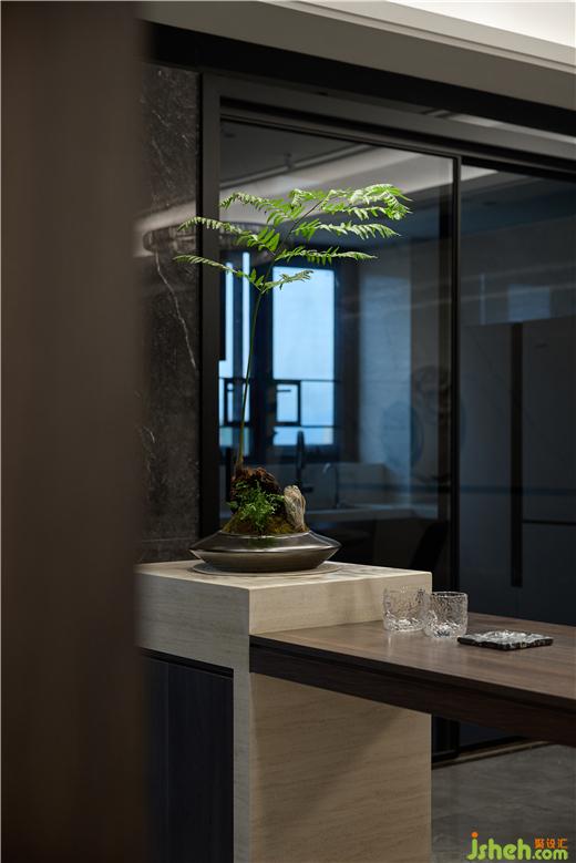 客廳與書房的綠植區(qū)采用了鋼化玻璃斜拼隔斷,使南北空氣形成對流讓植物植物更好的生長。裝修設(shè)計(jì)品茗區(qū)地面采用柔和磨砂磚,植物區(qū)采用了深色的毛石上墻,為這個(gè)小小的綠植區(qū)增添了出色的背景。