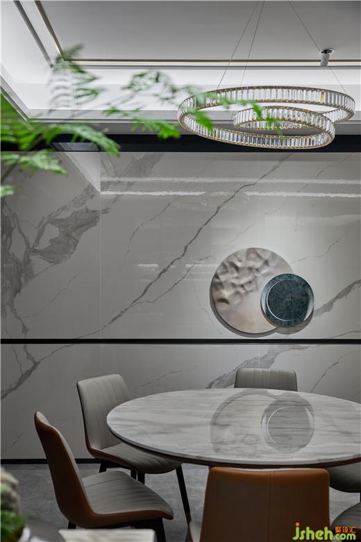 公區(qū)圍繞著整個(gè)空間布局了三個(gè)綠植區(qū),滿足主人對種植綠植的熱愛,裝修設(shè)計(jì)整個(gè)公區(qū)的墻面都是大理石加巖板的造型,獨(dú)一無二定制的黑色及銅色磨砂鈦金作為收口,更加承托出空間的高級感。
