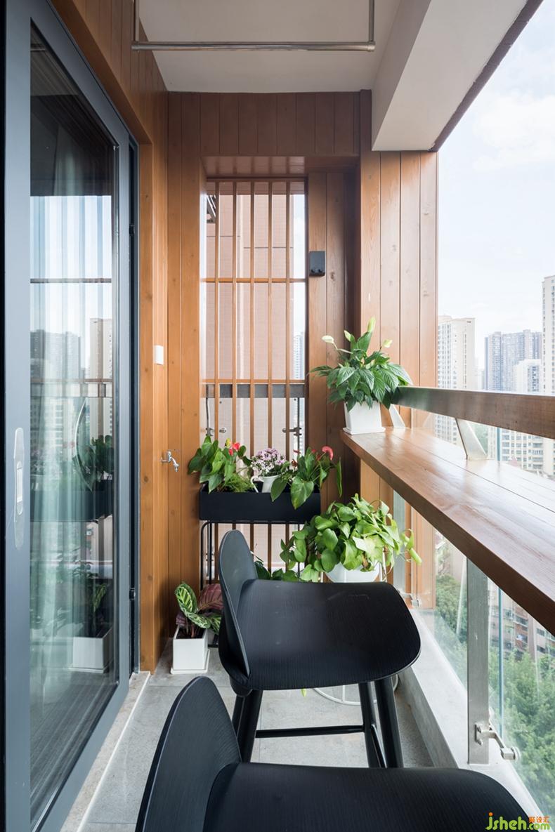 3.陽臺的設計很喜歡,用防腐木包裹,簡單的木板酒吧桌和高腳椅,以及綠植區(qū),吹吹風喝杯酒,十分愜意。