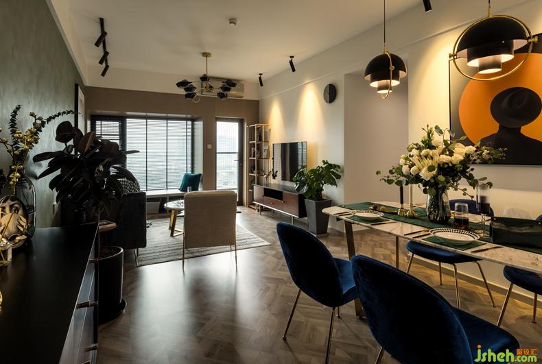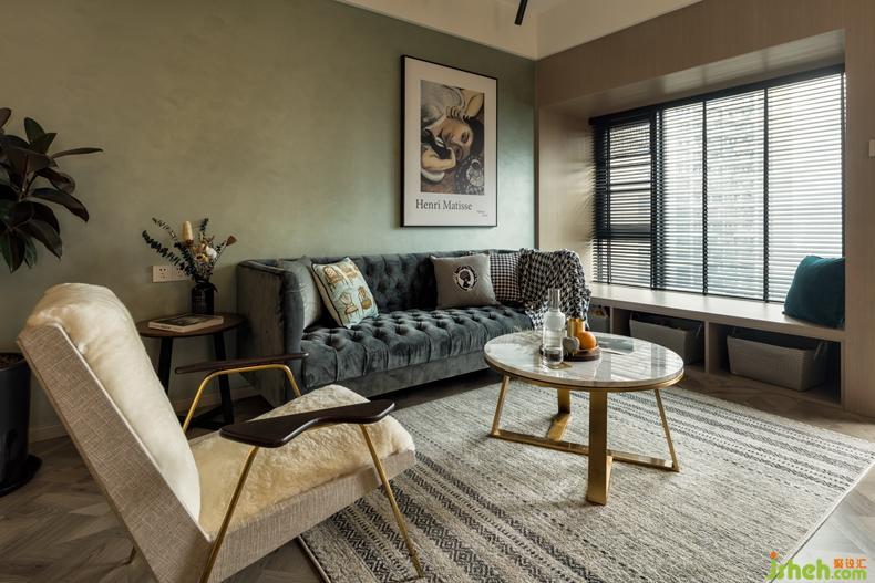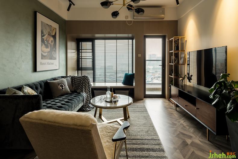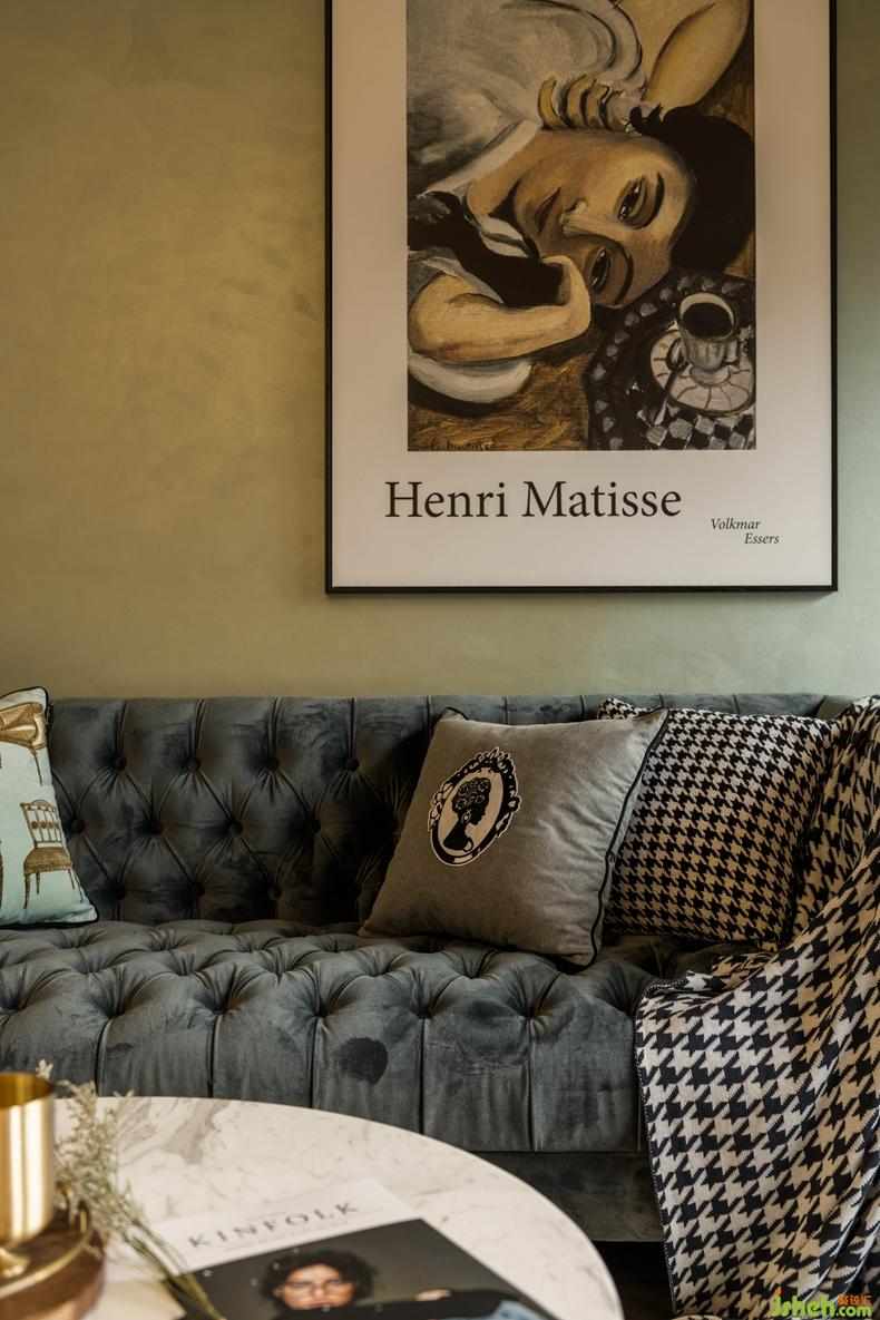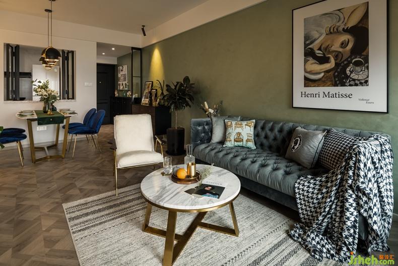 一面墻的尼絲絨綠搭配灰調(diào)的菱形復(fù)合地板提升了整個(gè)空間的復(fù)古感。